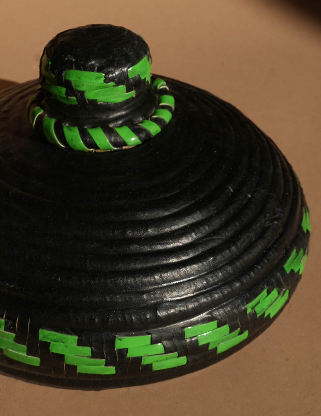 Upgrade your home decor with our Nene Teardrop Basket. Handmade in Senegal, this one-of-a-kind basket seamlessly blends fashion and function with its bold green color and practical lid. Perfect for storage or as a focal point, this basket is a must-have for a chic home. Its distinctive color and pattern were custom created in Senegal, with added leather accents.