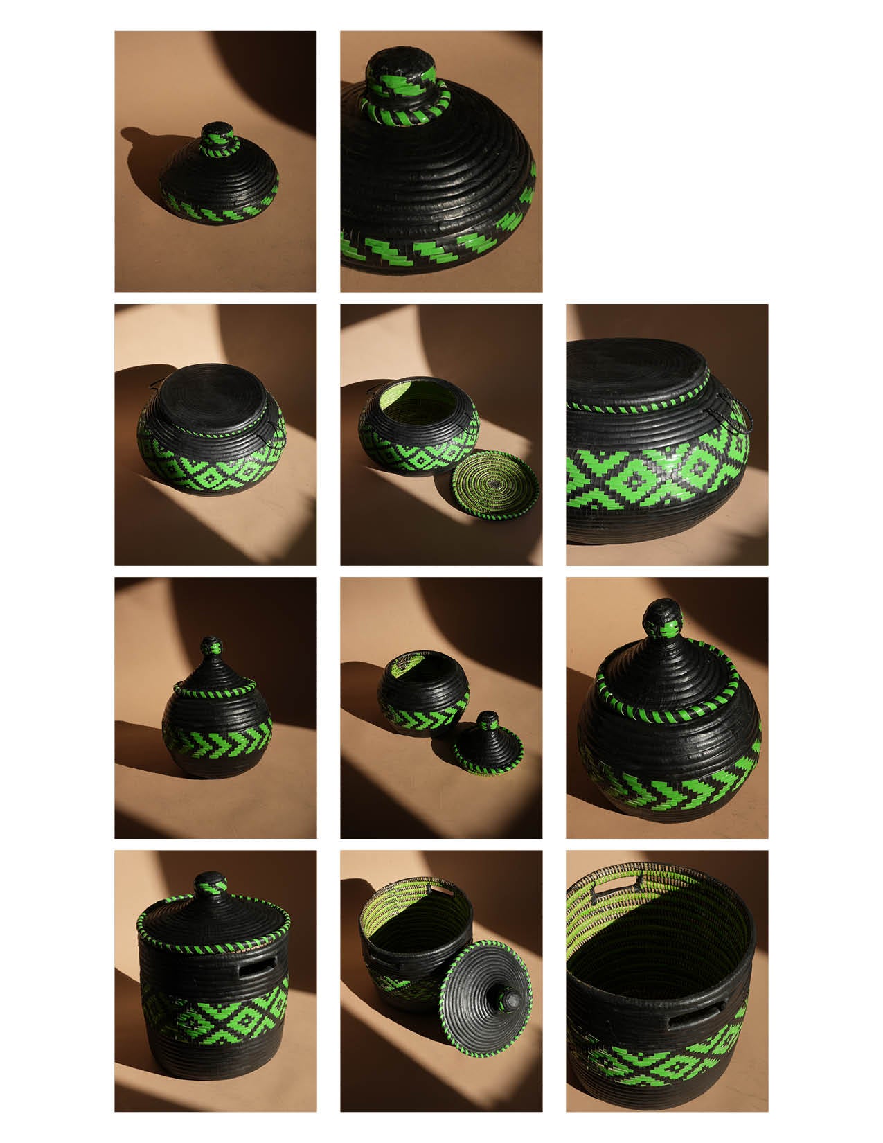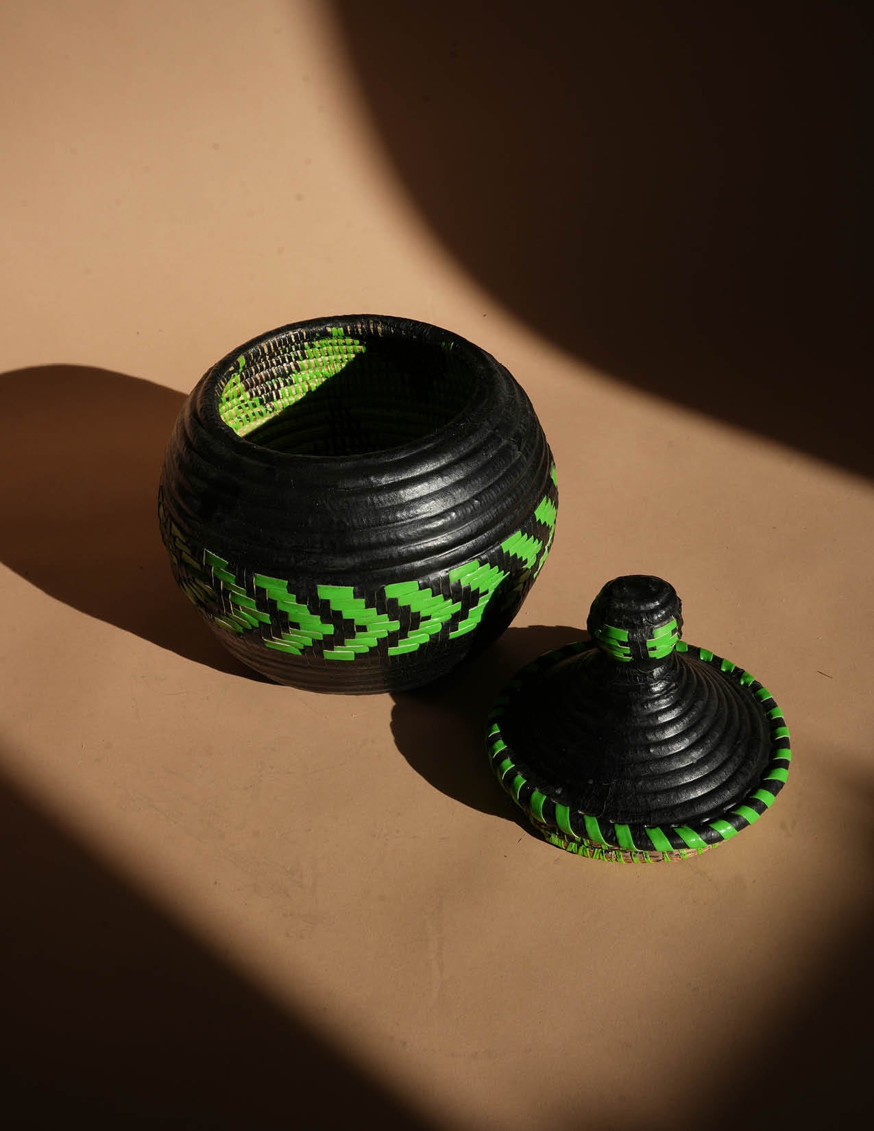 Enhance your living space with our Senegal-made Moudou Leather Teardrop Basket. This uniquely designed basket features a vibrant green color and a functional lid, combining style and utility. Whether used for storage or as a statement piece, this must-have basket adds a touch of chic to any home. Its one-of-a-kind color and pattern were handcrafted in Senegal, with a woven interior and leather exterior.
