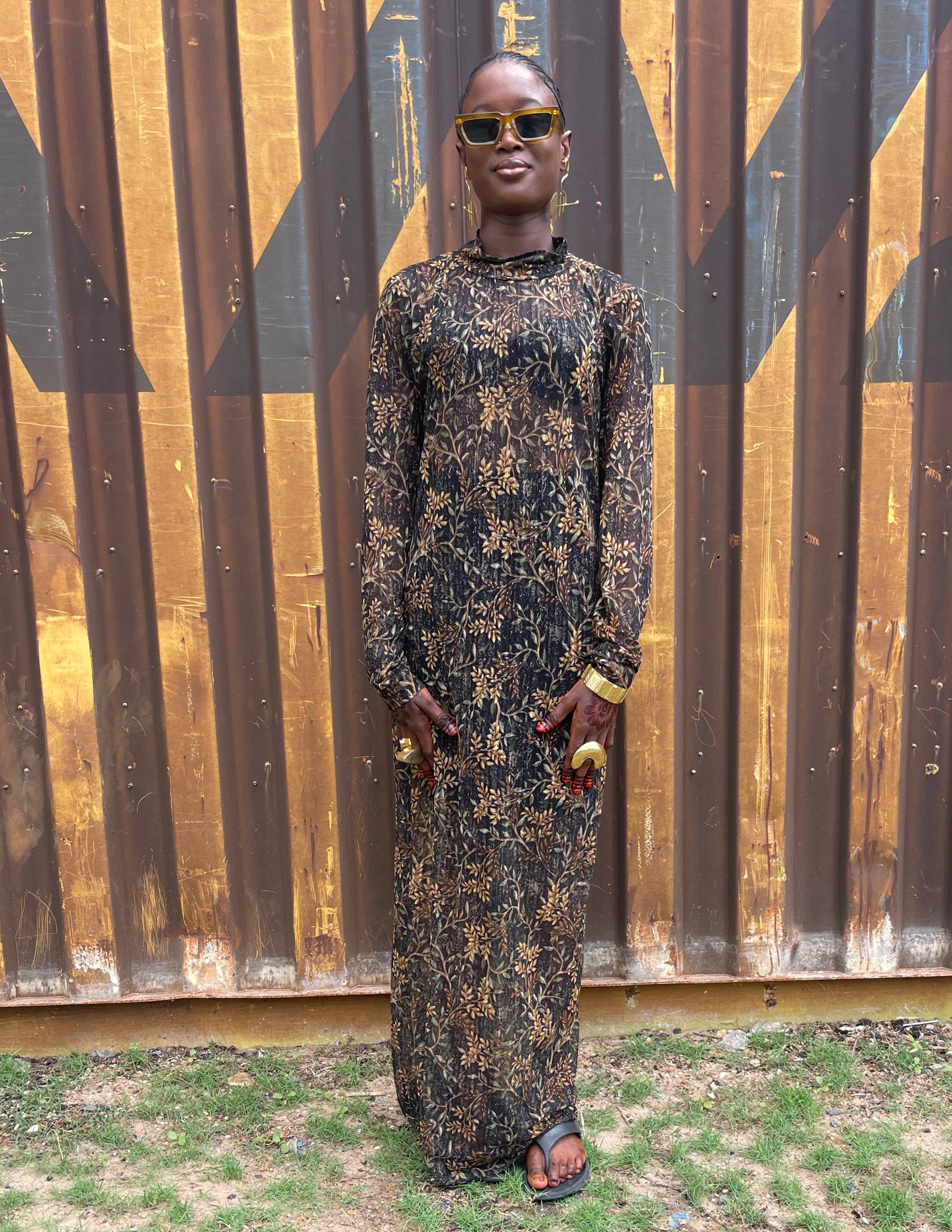 Our popular Constance Stretch Maxi Dress adorns your silhouette with deep woodsy florals. This new print is fresh for our DSS2JFK5 collection, it was made in Senegal from delicate sheer printed nylon/ spandex that won’t constrict and is unlined for body-celebrating flair.