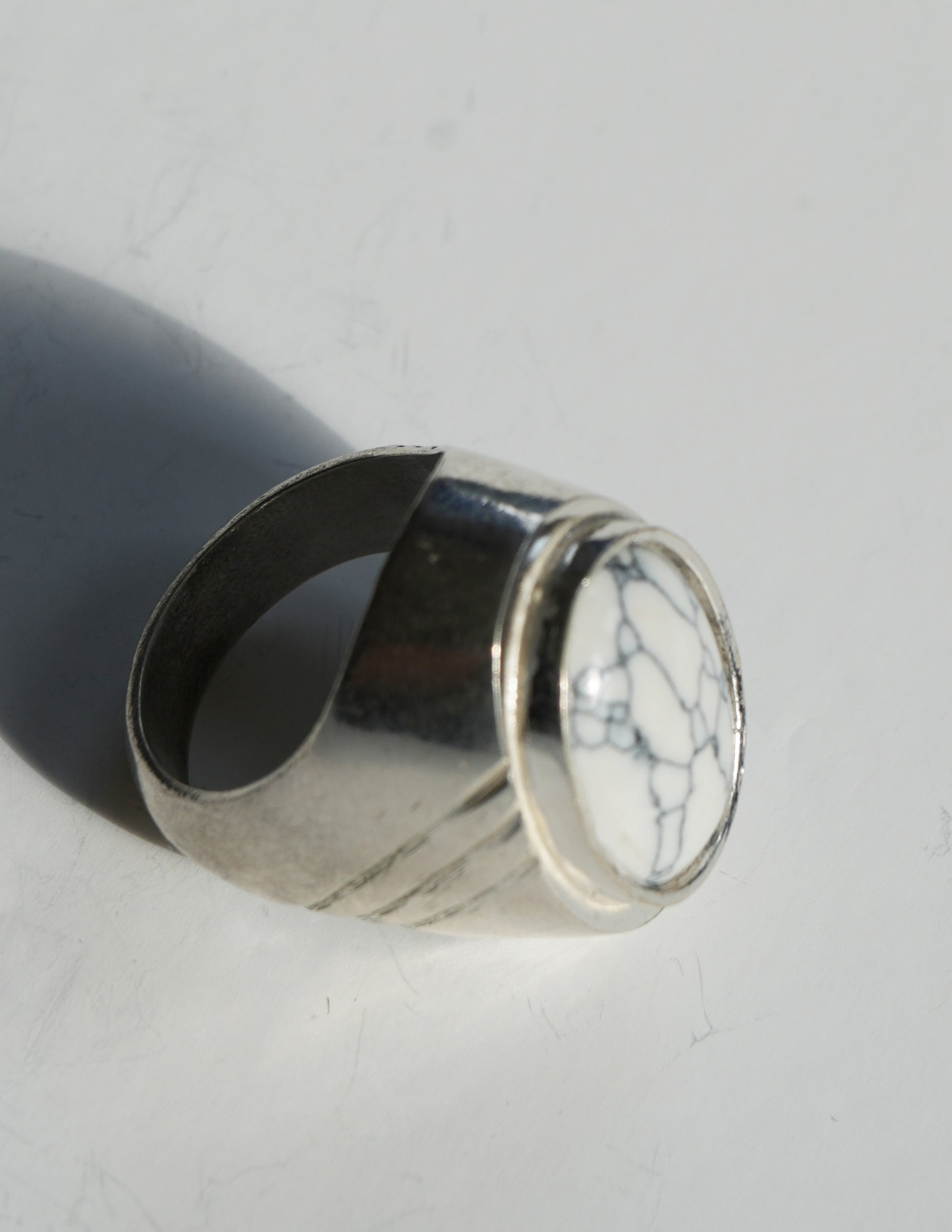 The Ezana ring is a sterling silver signet ring with a white Turquoise stone.