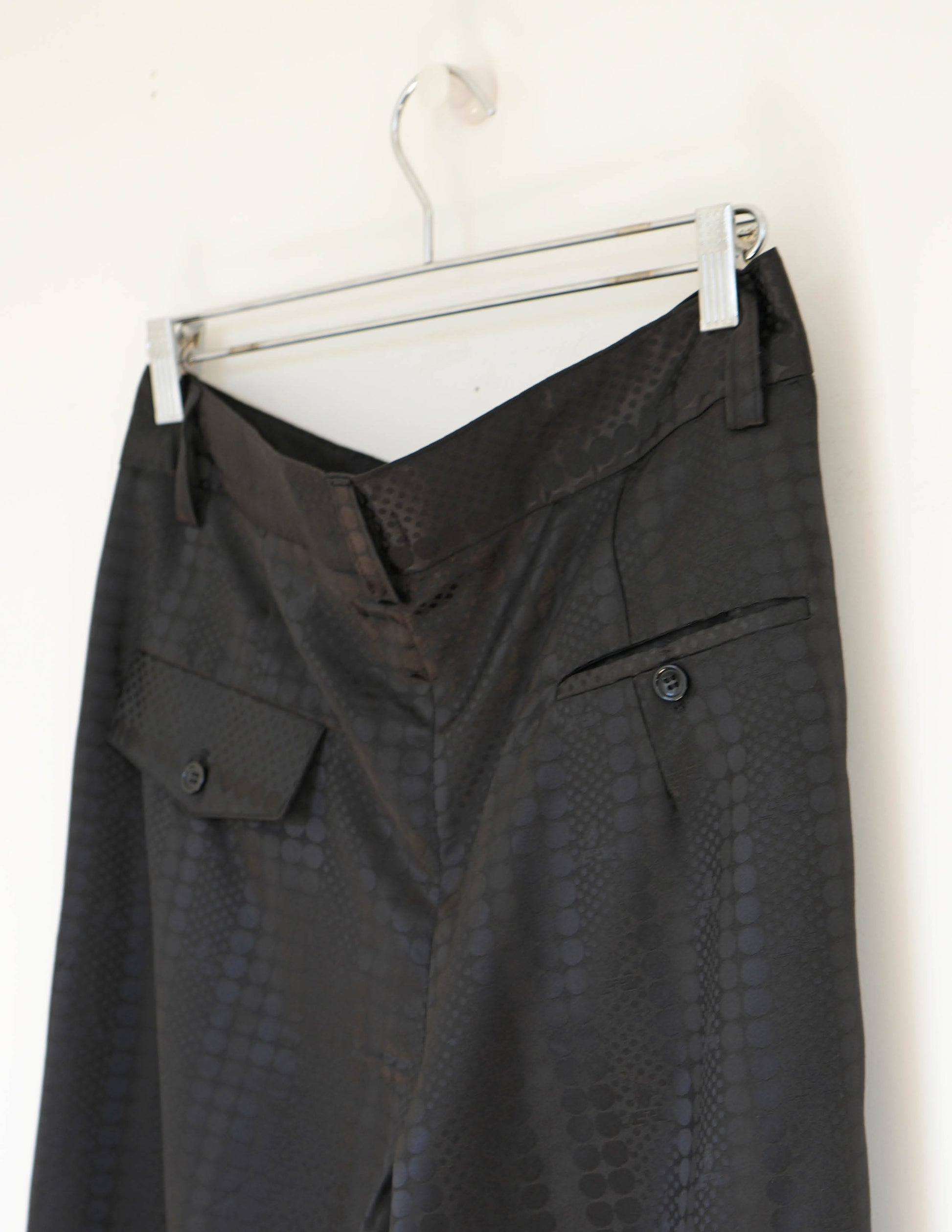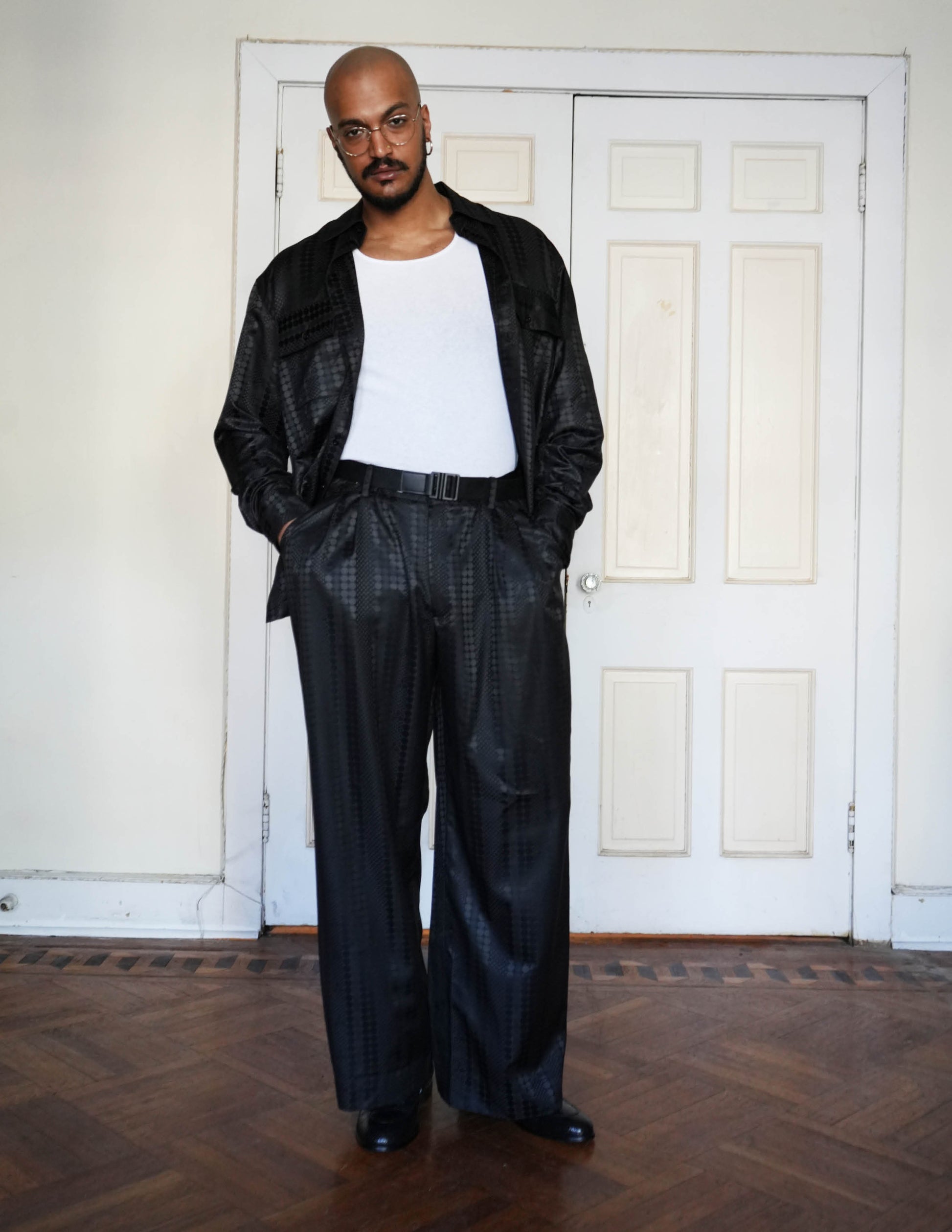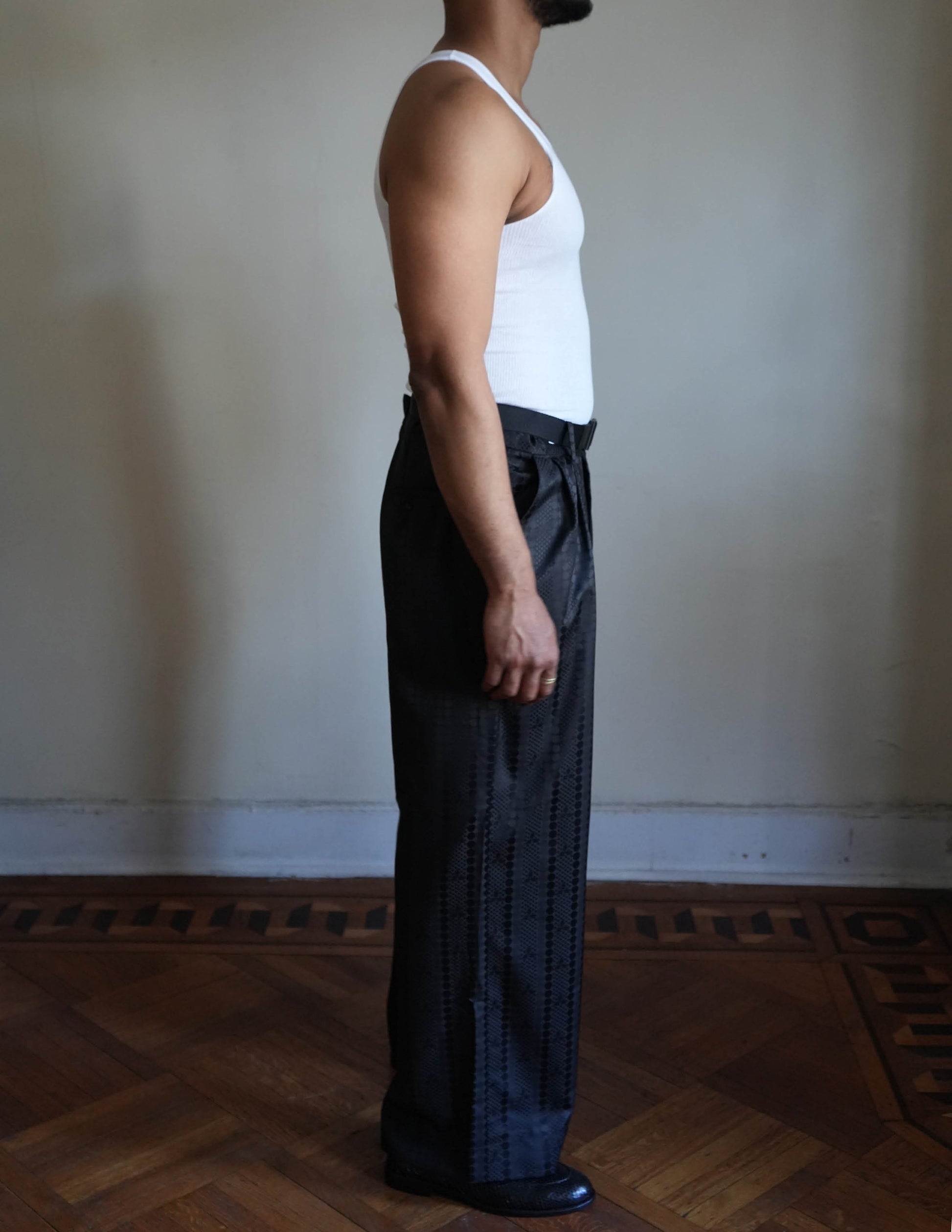 Skilled Senegalese artisans tailored our Gamble pants, a classic wide-leg pair in lustrous satin jacquard with an intricate dotted motif. Pair with our matching Gamble shirt.