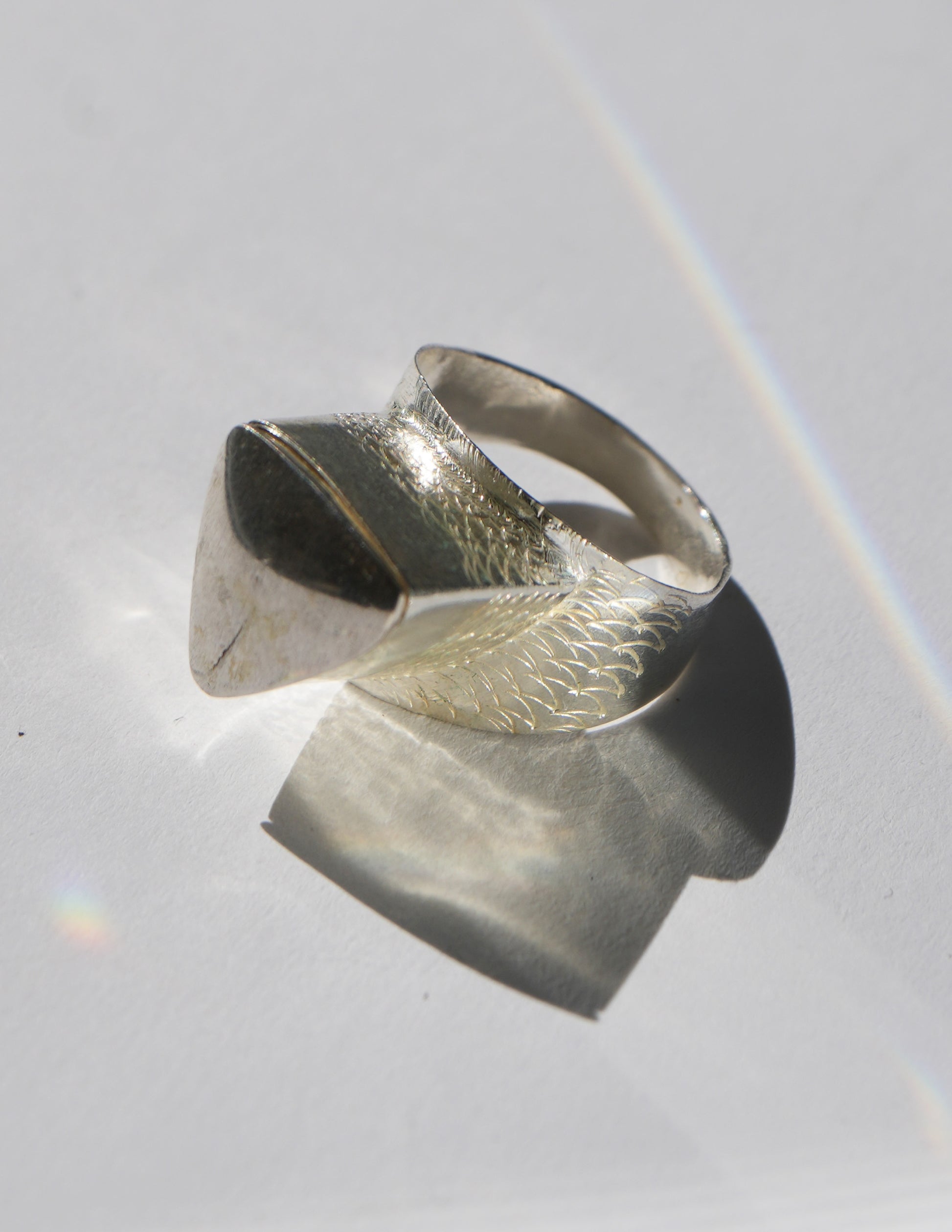 This Sterling silver ring is triangle-shaped and etched delicately with traditional designs.
