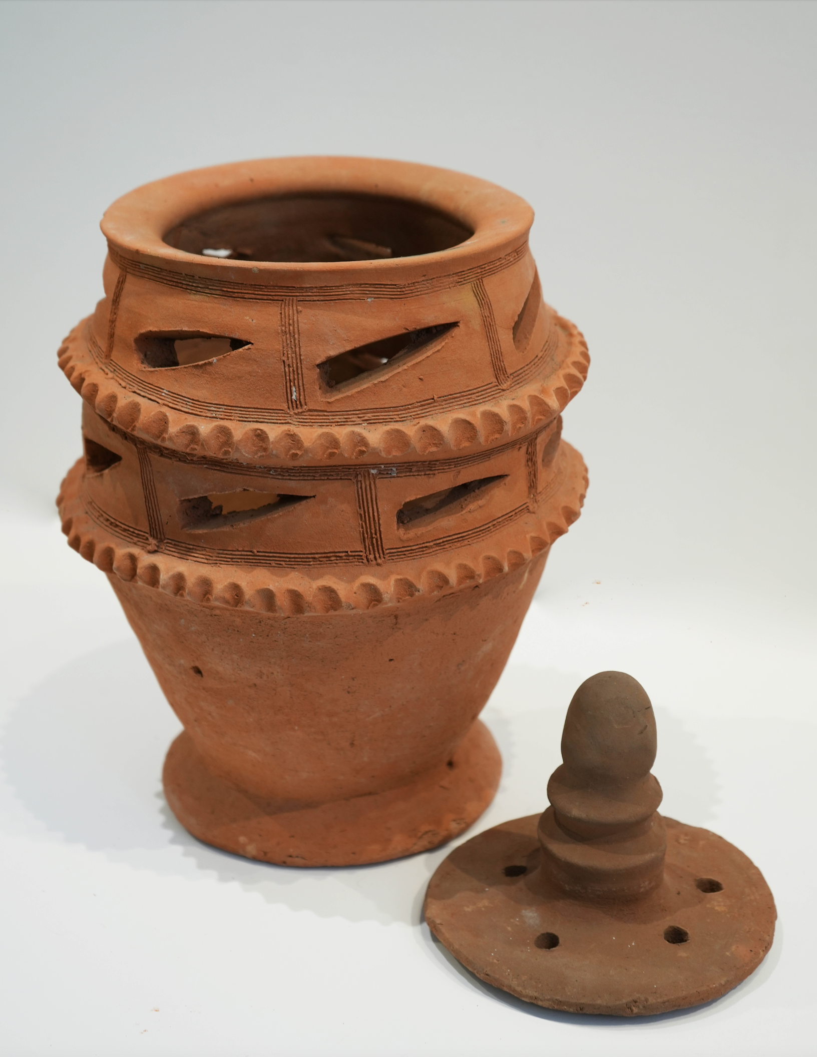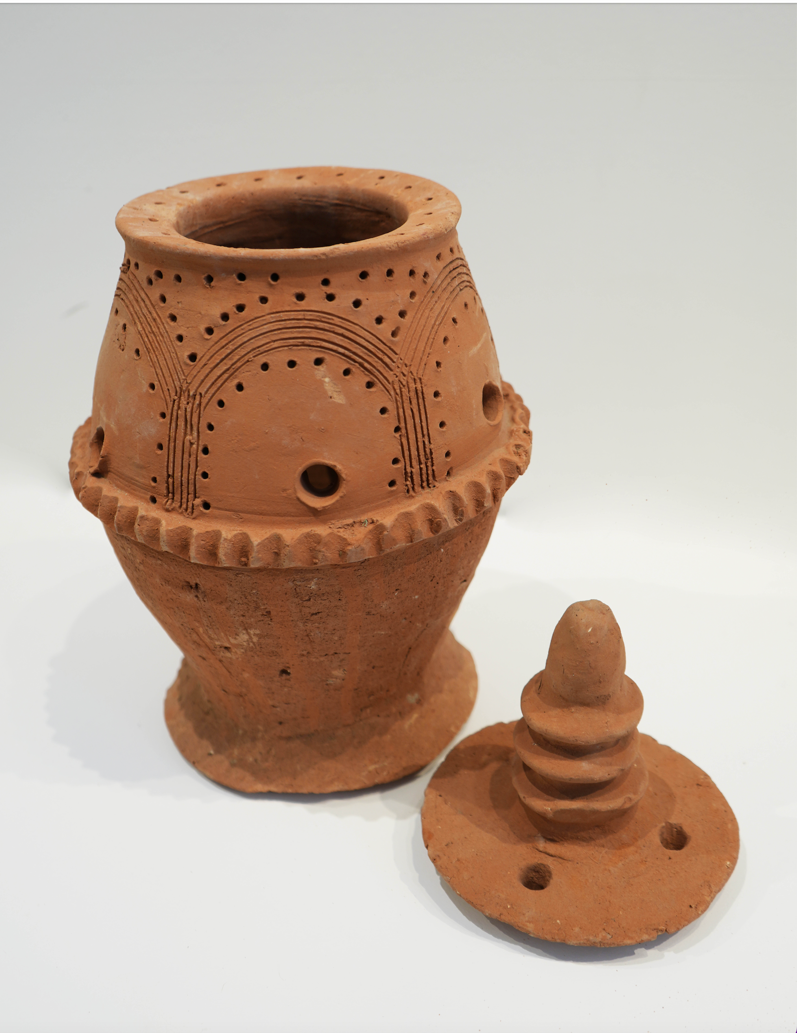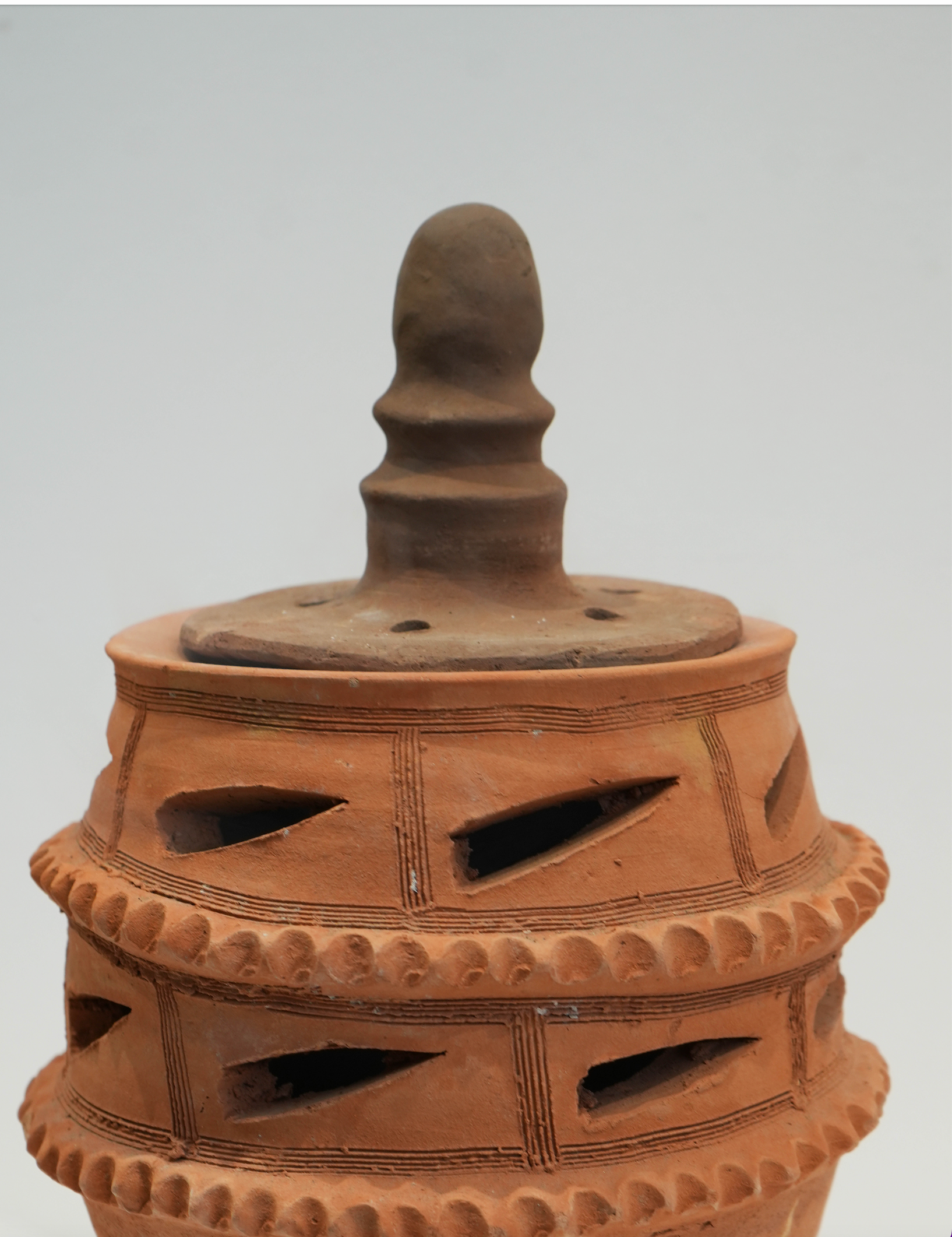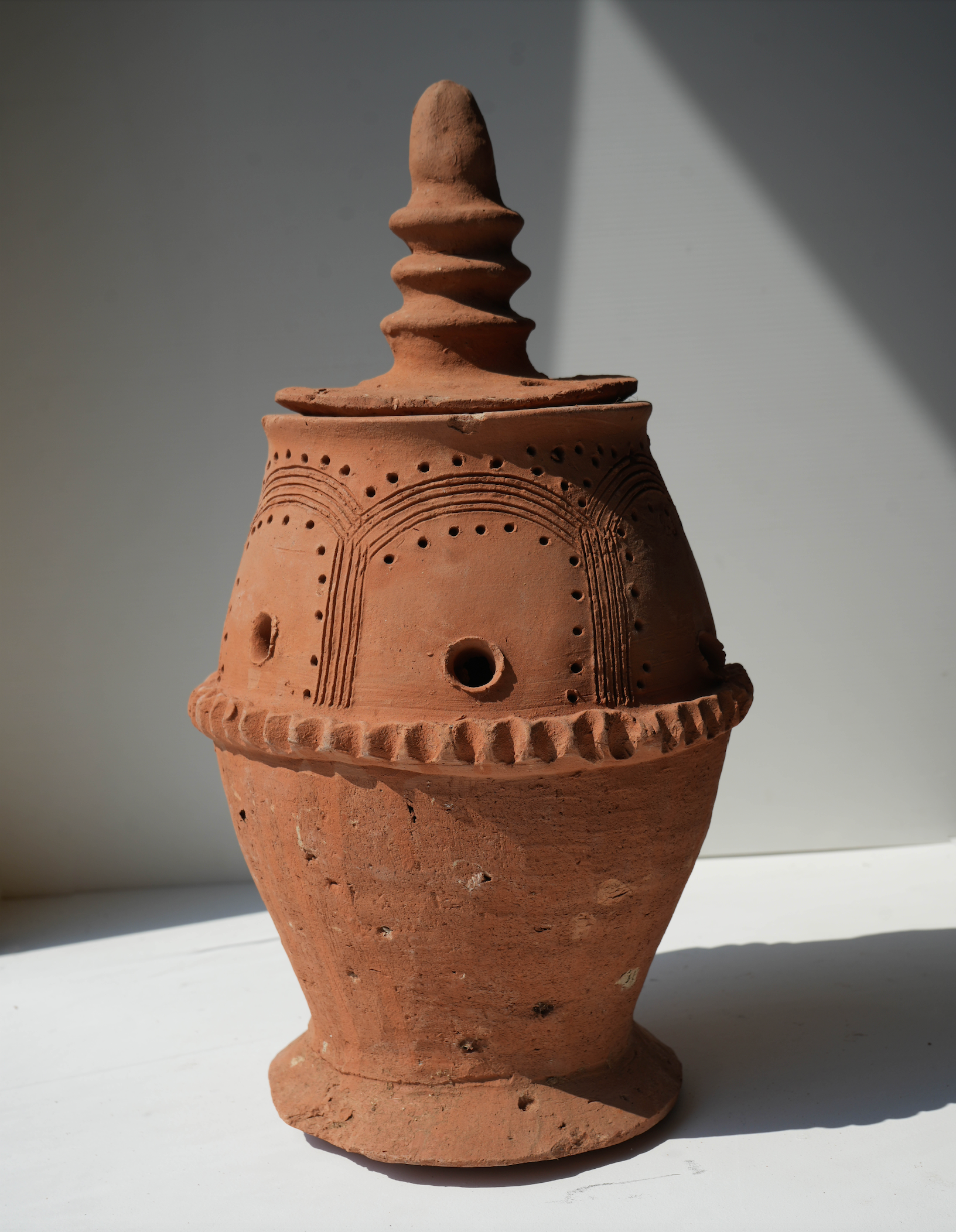 Experience the traditional style of burning incense with this handcrafted clay incense burner from Senegal. Its unique design and natural materials make it a beautiful and stylish addition to any space. Each one is individually handcrafted and may vary in size and color, making it truly one-of-a-kind. Fill your space with natural scents and add an artisanal touch to your home decor.