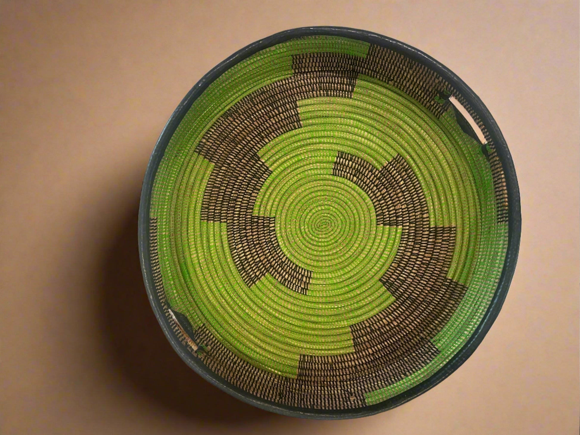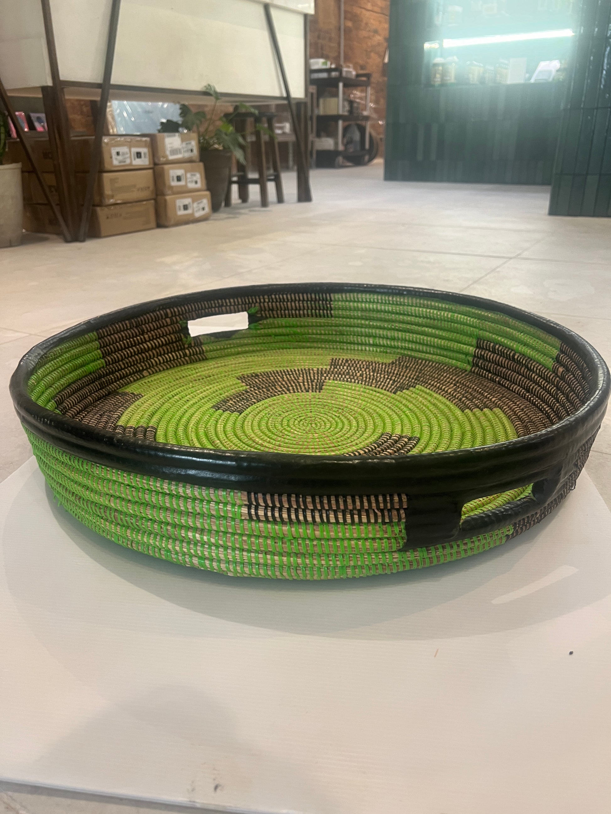 Hand-woven in Senegal, this shallow basket boasts sturdy handles for convenient transport. Perfect for serving food and drinks, it's sure to impress at your next gathering. The unique color and design were custom-made in Senegal, with added leather detailing.