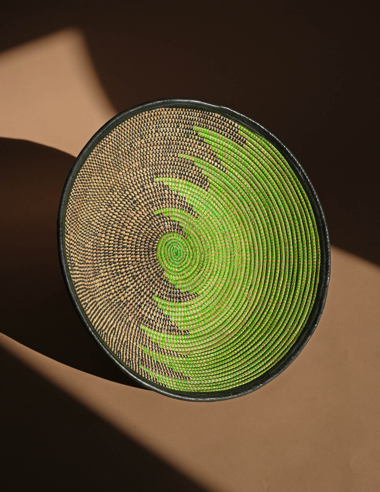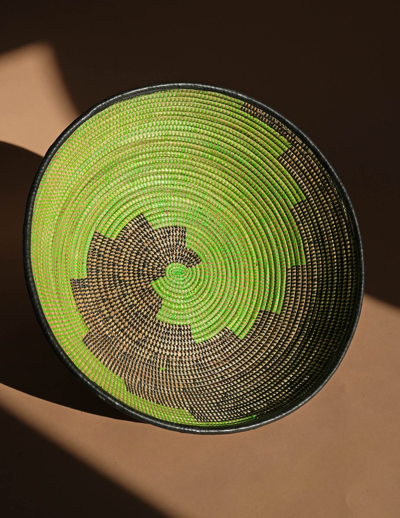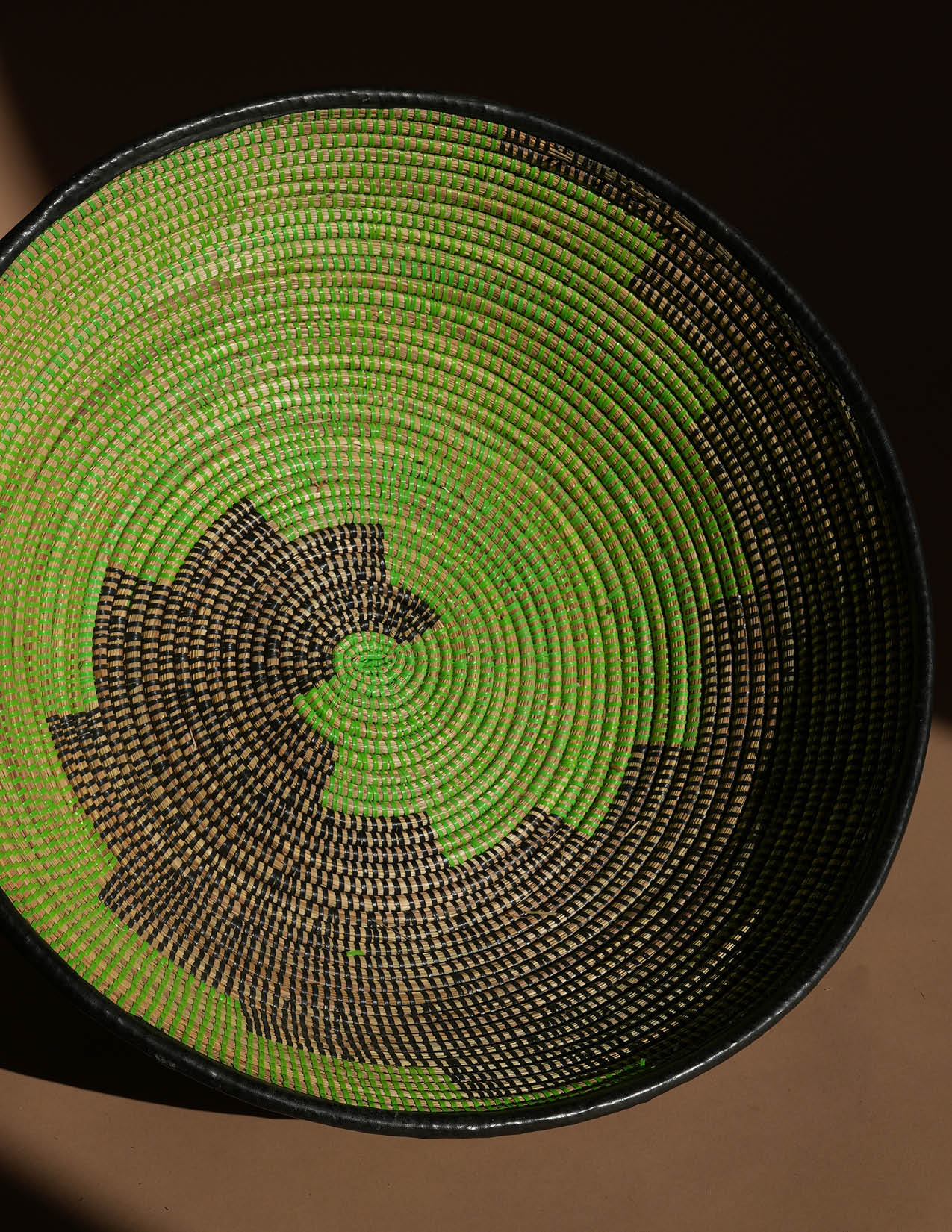 This woven vegetable basket from Senegal is both functional and fashionable. It offers plenty of storage while maintaining a sleek, minimal design. The vibrant green color adds a charming touch to any room. The unique design and color were custom-made with added leather details.