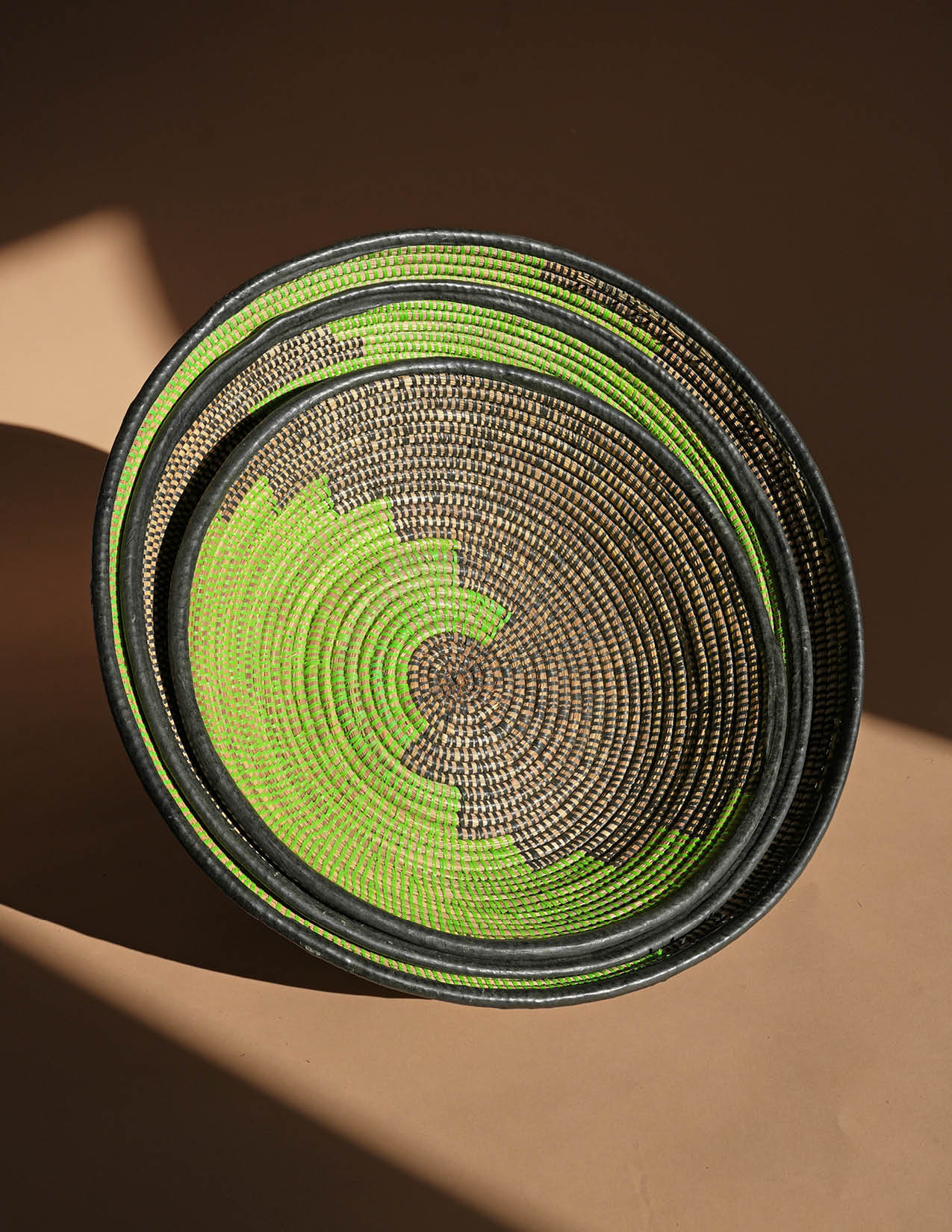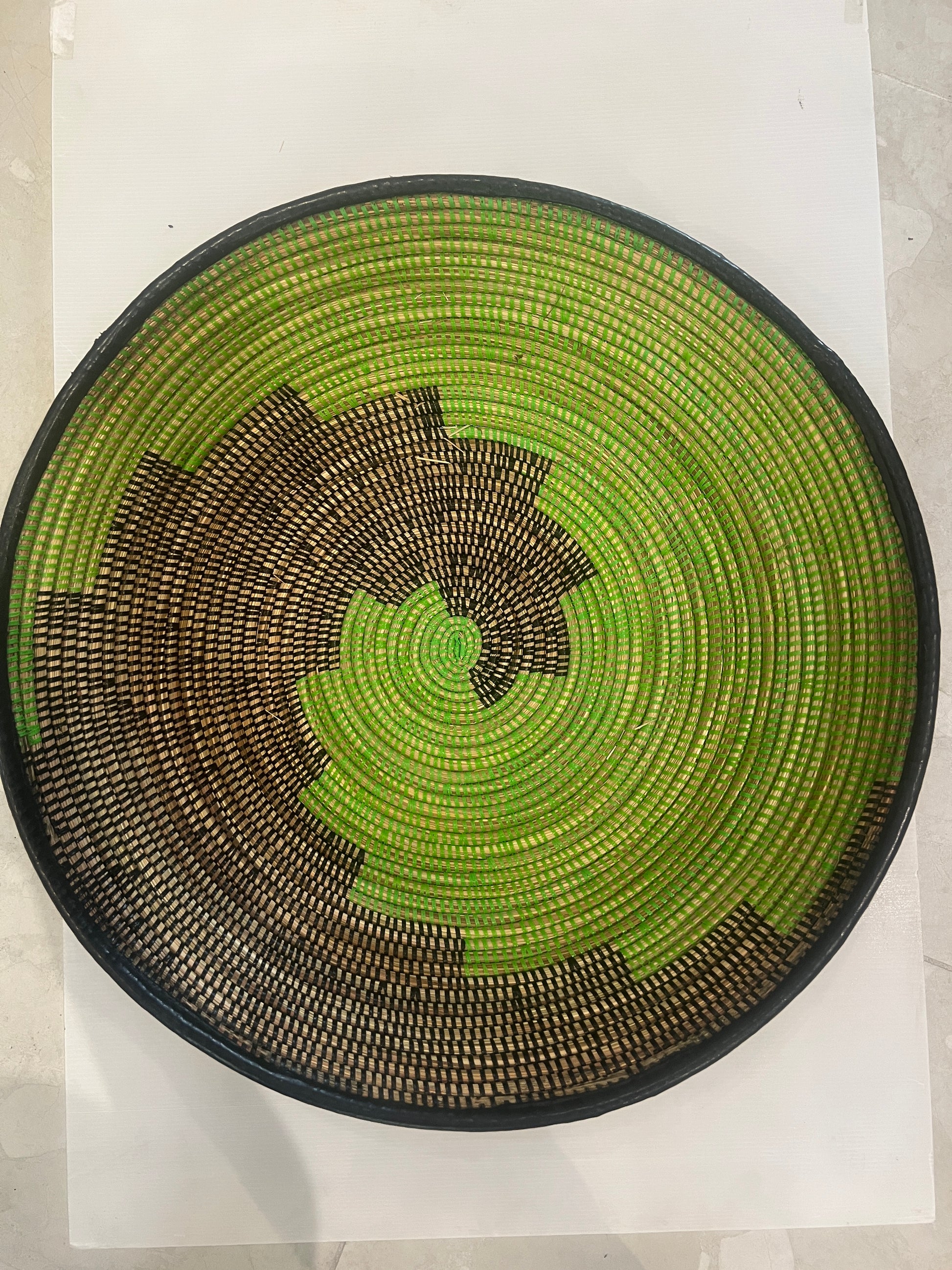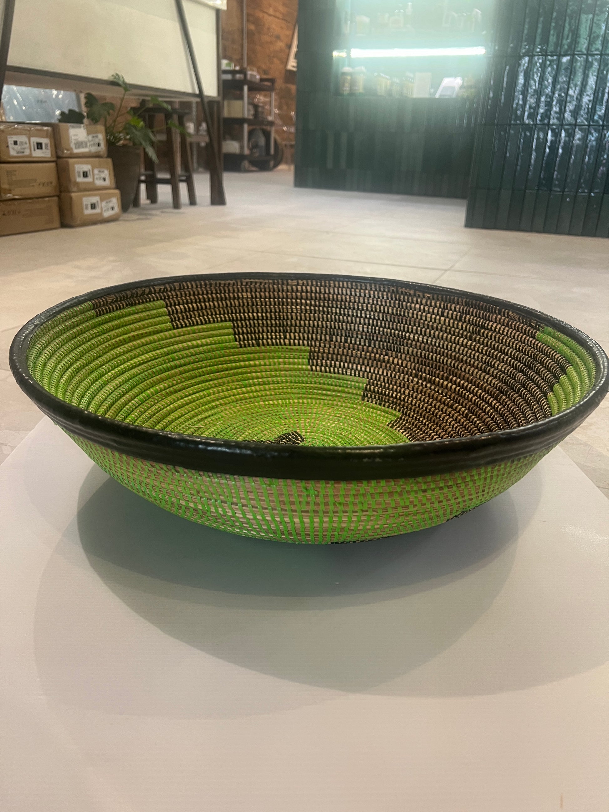 This woven vegetable basket from Senegal is both functional and fashionable. It offers plenty of storage while maintaining a sleek, minimal design. The vibrant green color adds a charming touch to any room. The unique design and color were custom-made with added leather details.
