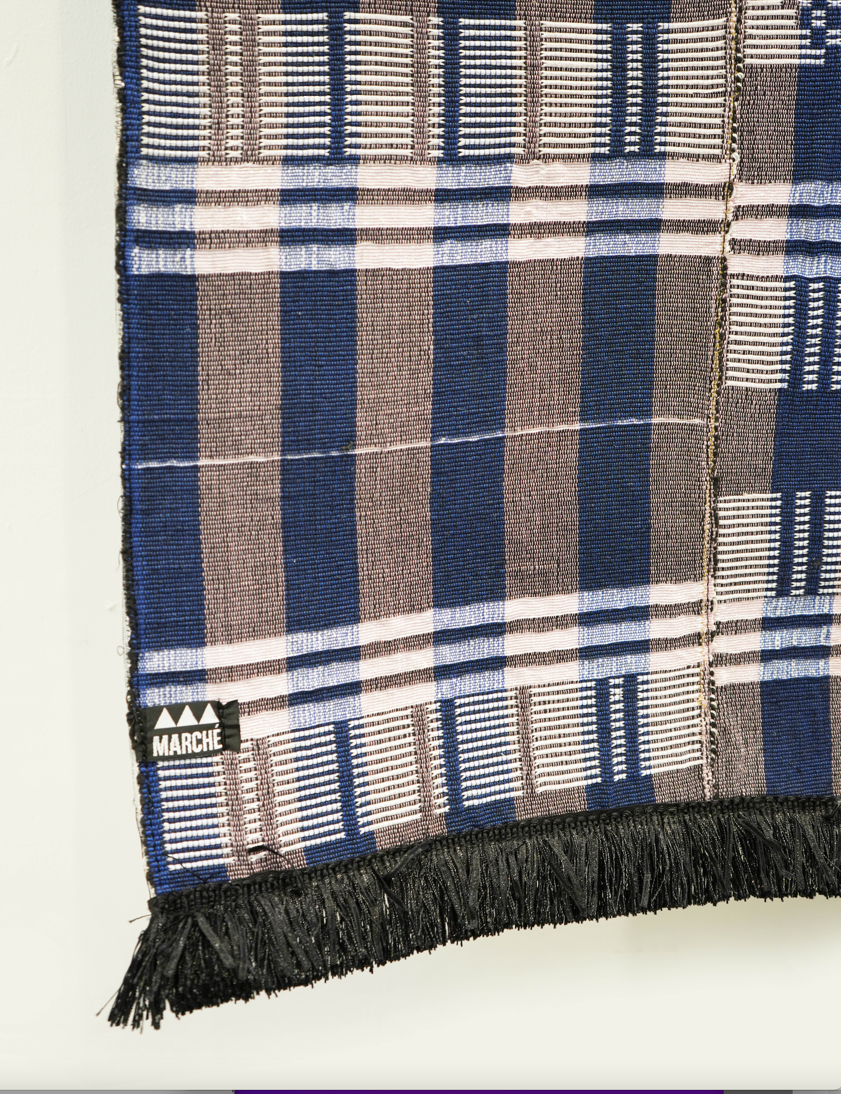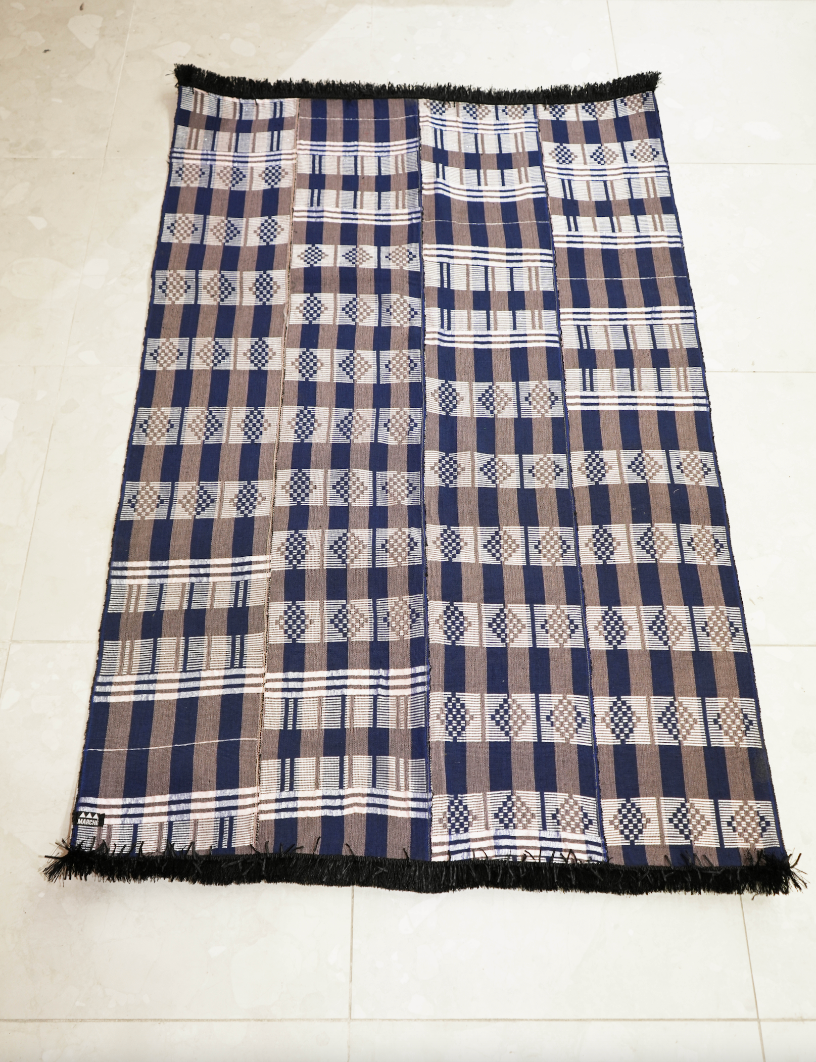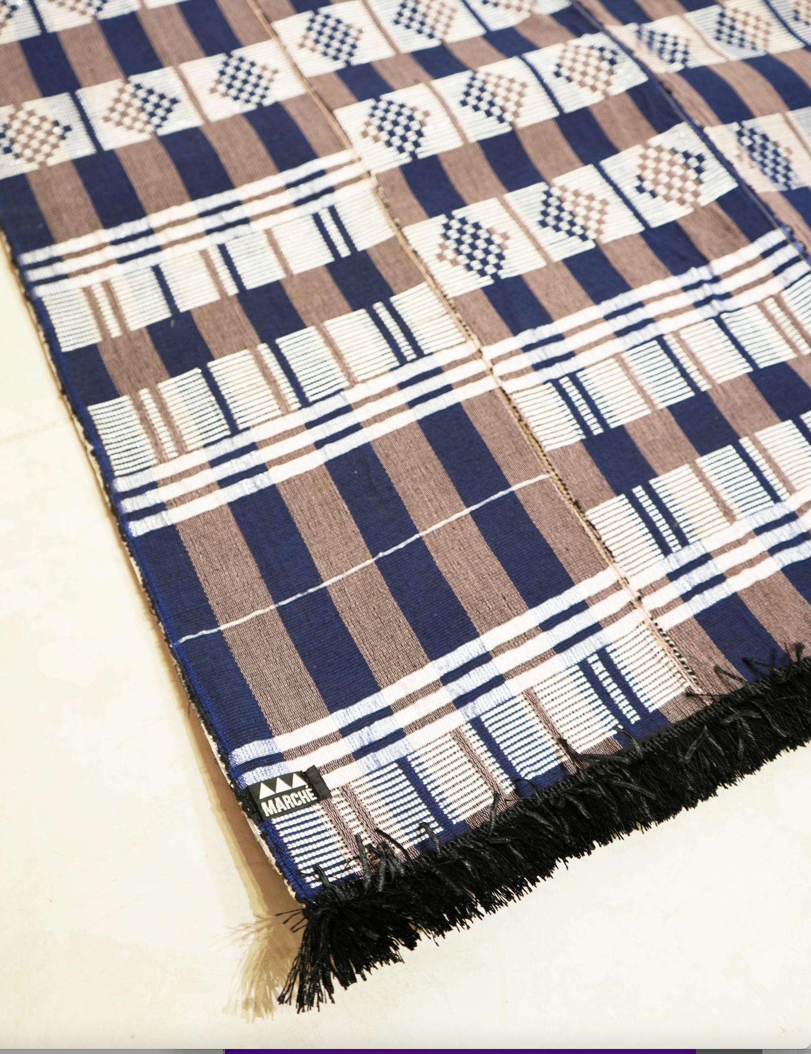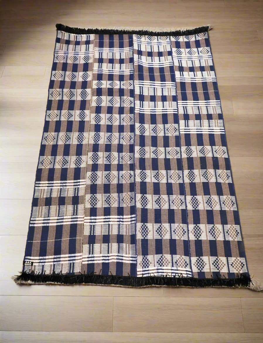 This large handwoven rug from Senegal, measuring 70 x 42 inches, is a unique and beautifully crafted piece. With a non-slip rubber backing for added comfort and intricate hand weaving, it brings a touch of sophistication to any space.