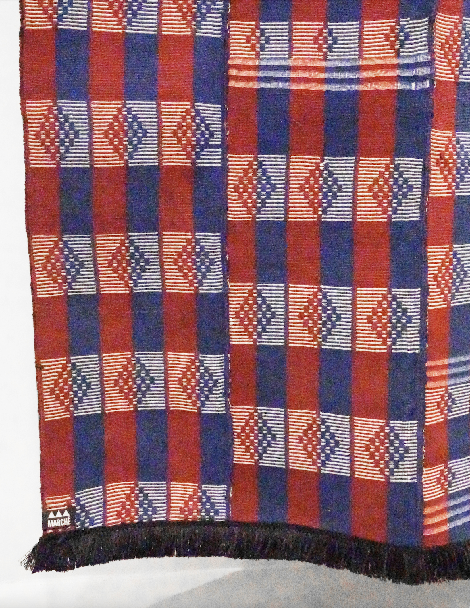 This large handwoven rug from Senegal, measuring 70 x 42 inches, is a unique and beautifully crafted piece. With a non-slip rubber backing for added comfort and intricate hand weaving, it brings a touch of sophistication to any space.