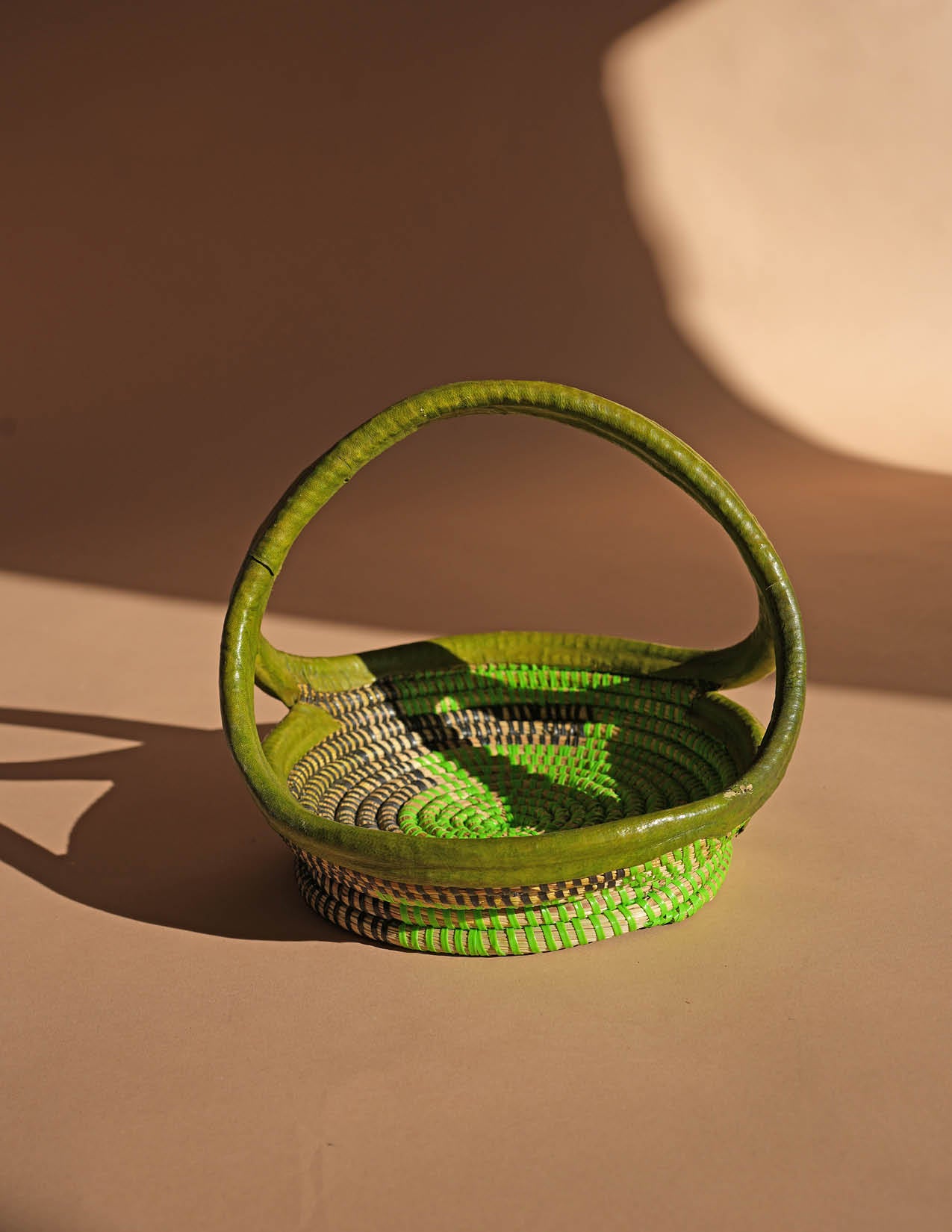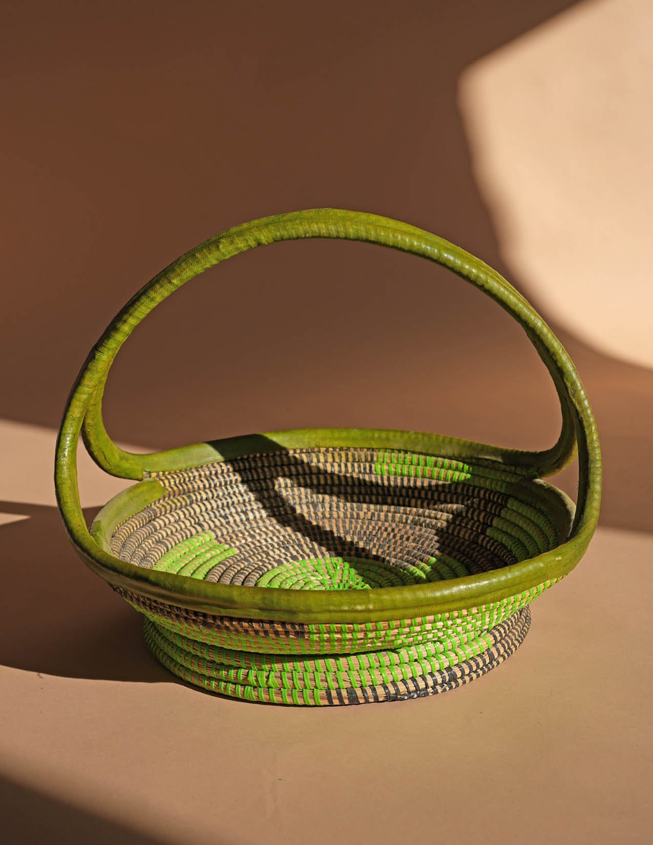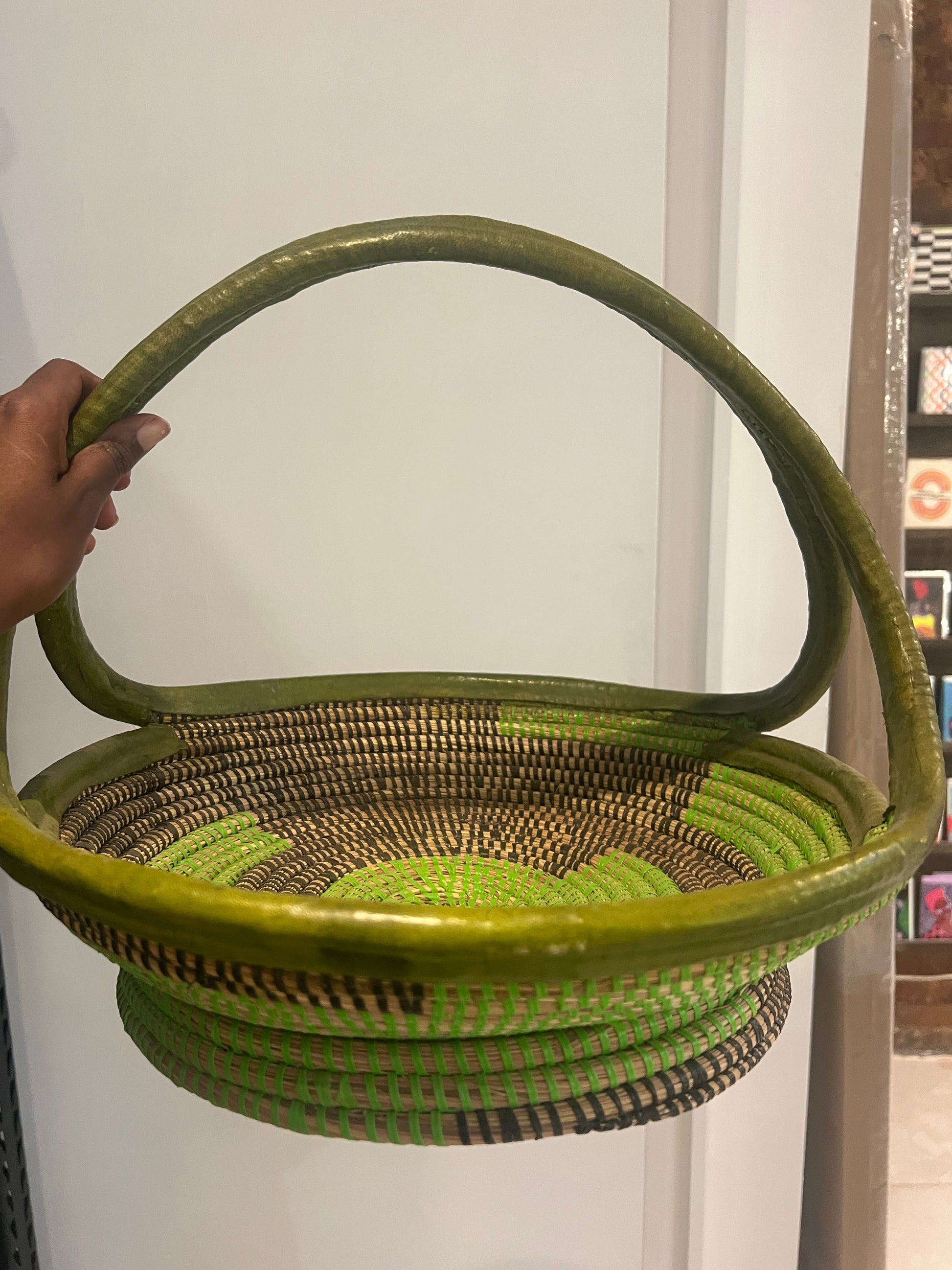 This fruit basket with handle is the ideal storage solution for your home - simple, stylish, and functional. Its vibrant green color adds a pop of color to any room, while the sturdy handle and flat design allow for easy carrying and storage. Handcrafted in Senegal, this basket features a unique color and design with added leather detailing.