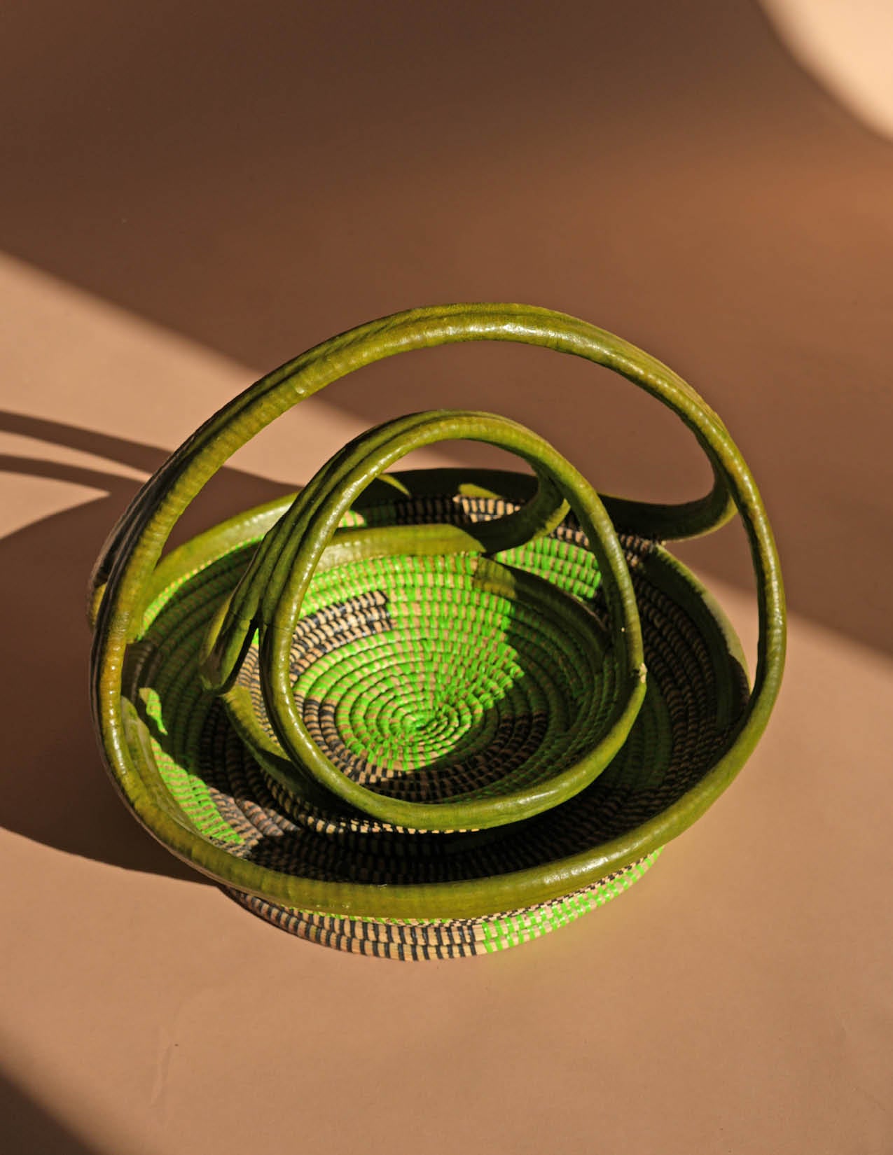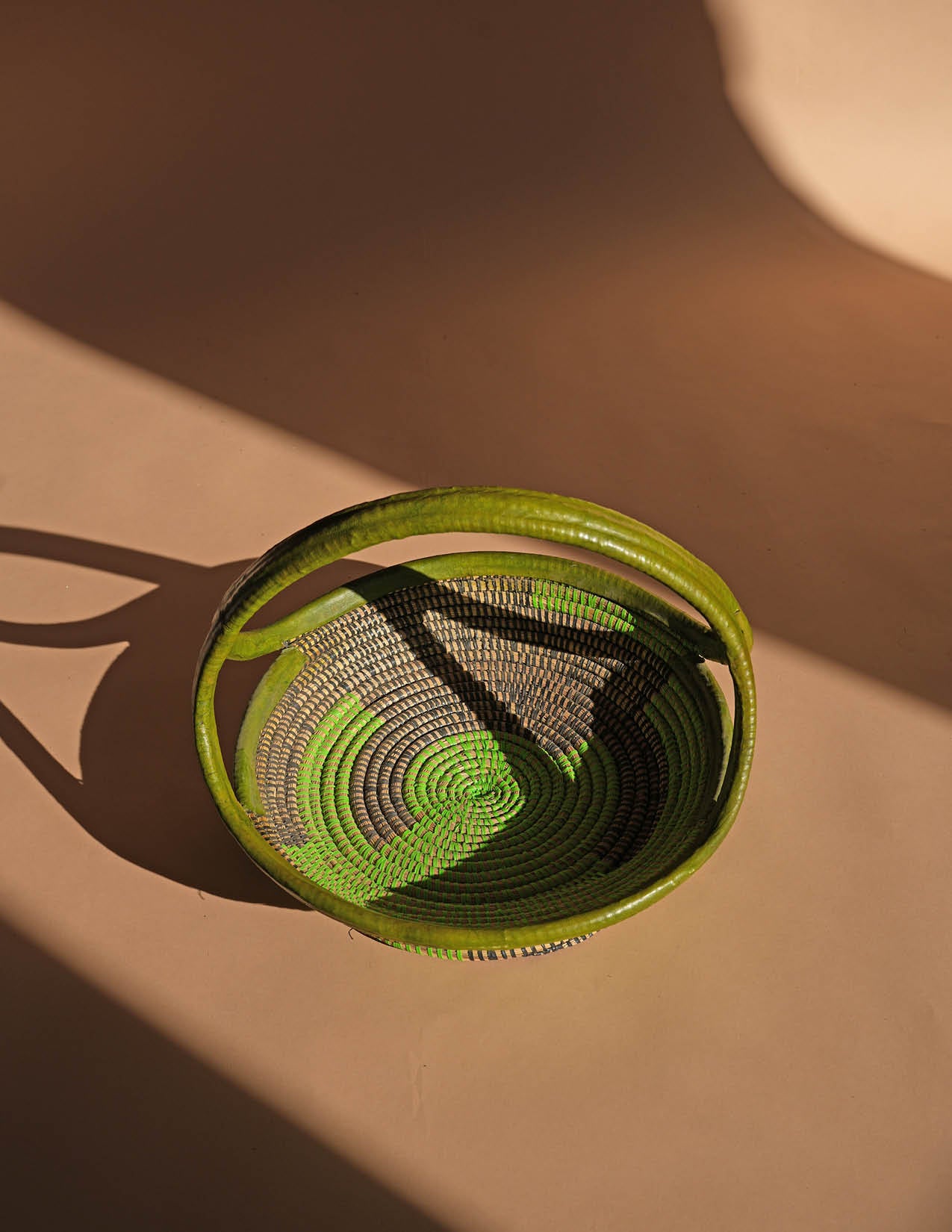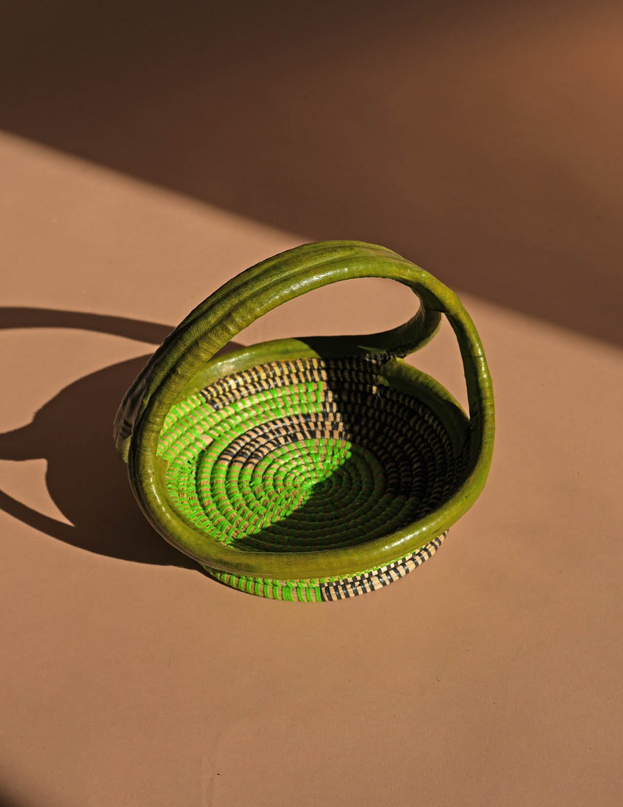 This fruit basket with handle is the ideal storage solution for your home - simple, stylish, and functional. Its vibrant green color adds a pop of color to any room, while the sturdy handle and flat design allow for easy carrying and storage. Handcrafted in Senegal, this basket features a unique color and design with added leather detailing.