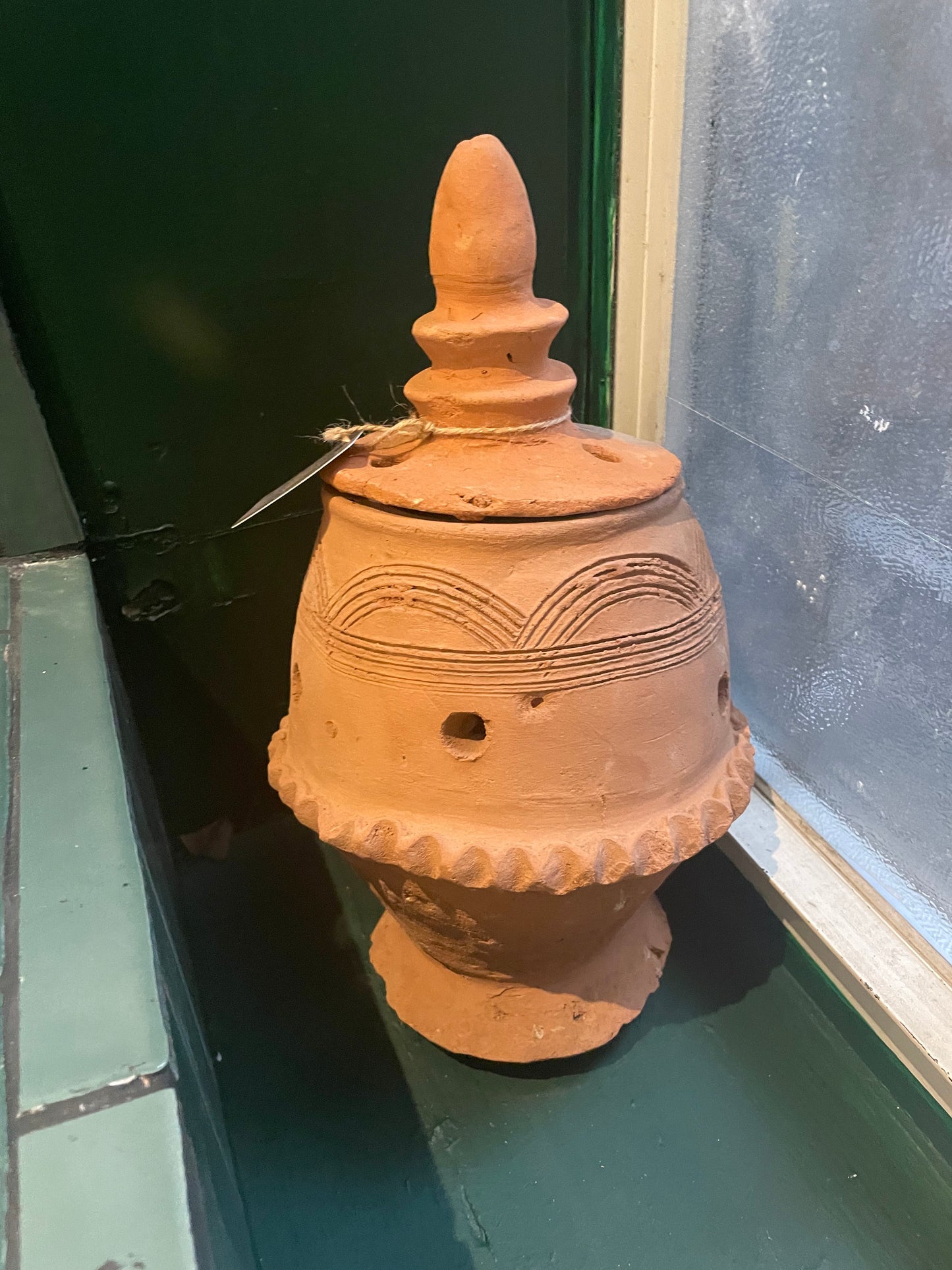 Experience the traditional style of burning incense with this handcrafted clay incense burner from Senegal. Its unique design and natural materials make it a beautiful and stylish addition to any space. Each one is individually handcrafted and may vary in size and color, making it truly one-of-a-kind. Fill your space with natural scents and add an artisanal touch to your home decor.