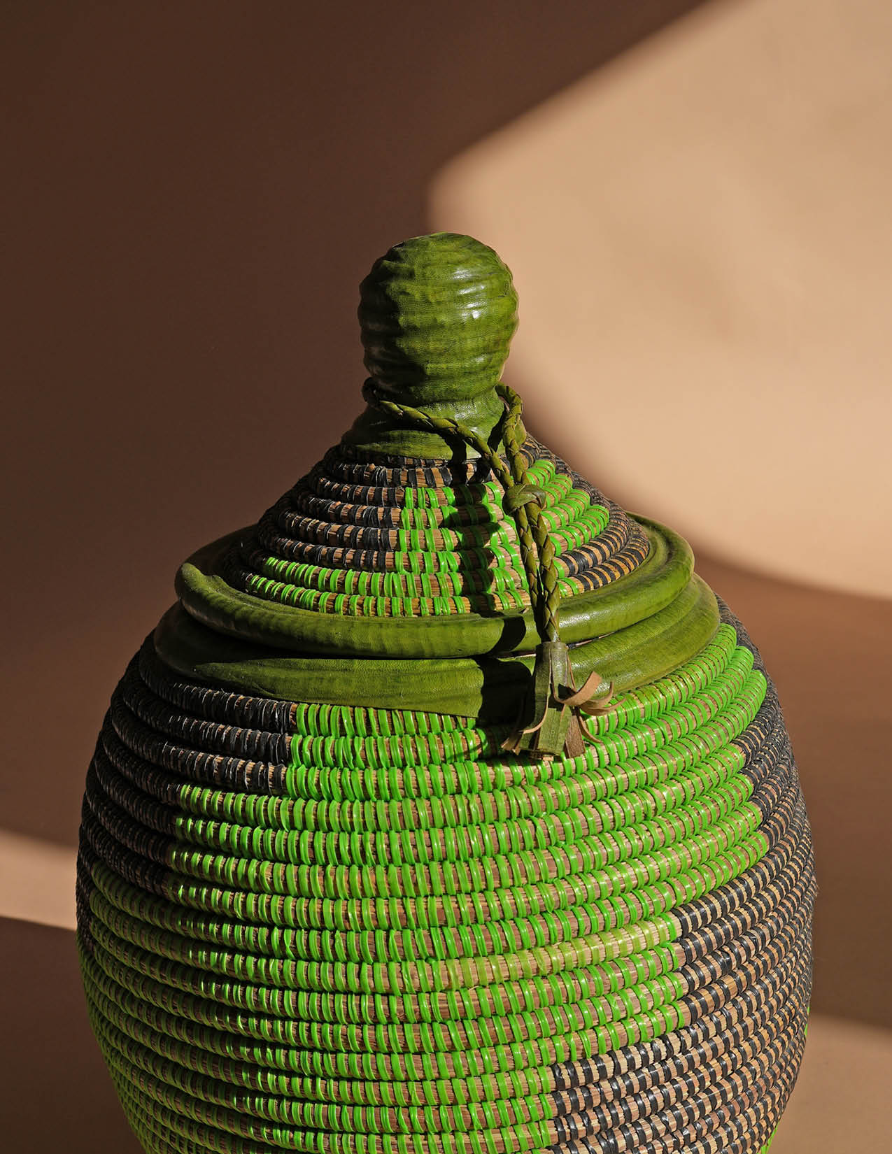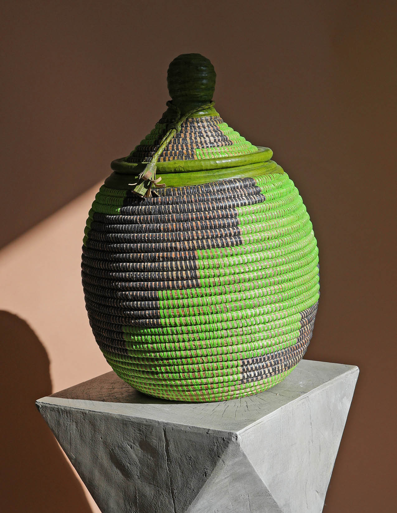 Upgrade your home decor with our Maude Teardrop Basket. Handmade in Senegal, this one-of-a-kind basket seamlessly blends fashion and function with its bold green color and practical lid. Perfect for storage or as a focal point, this basket is a must-have for a chic home. Its distinctive color and pattern were custom created in Senegal, with added leather accents.