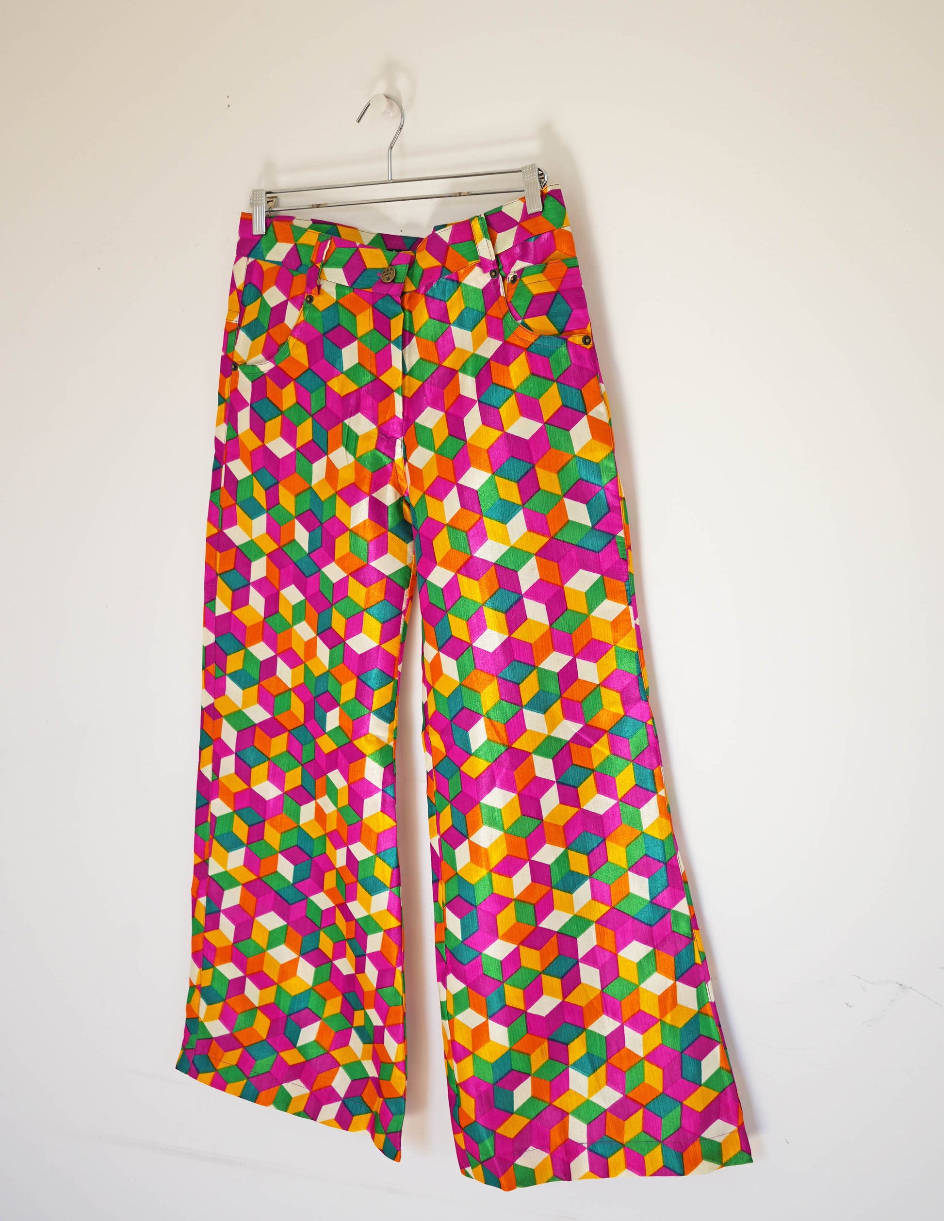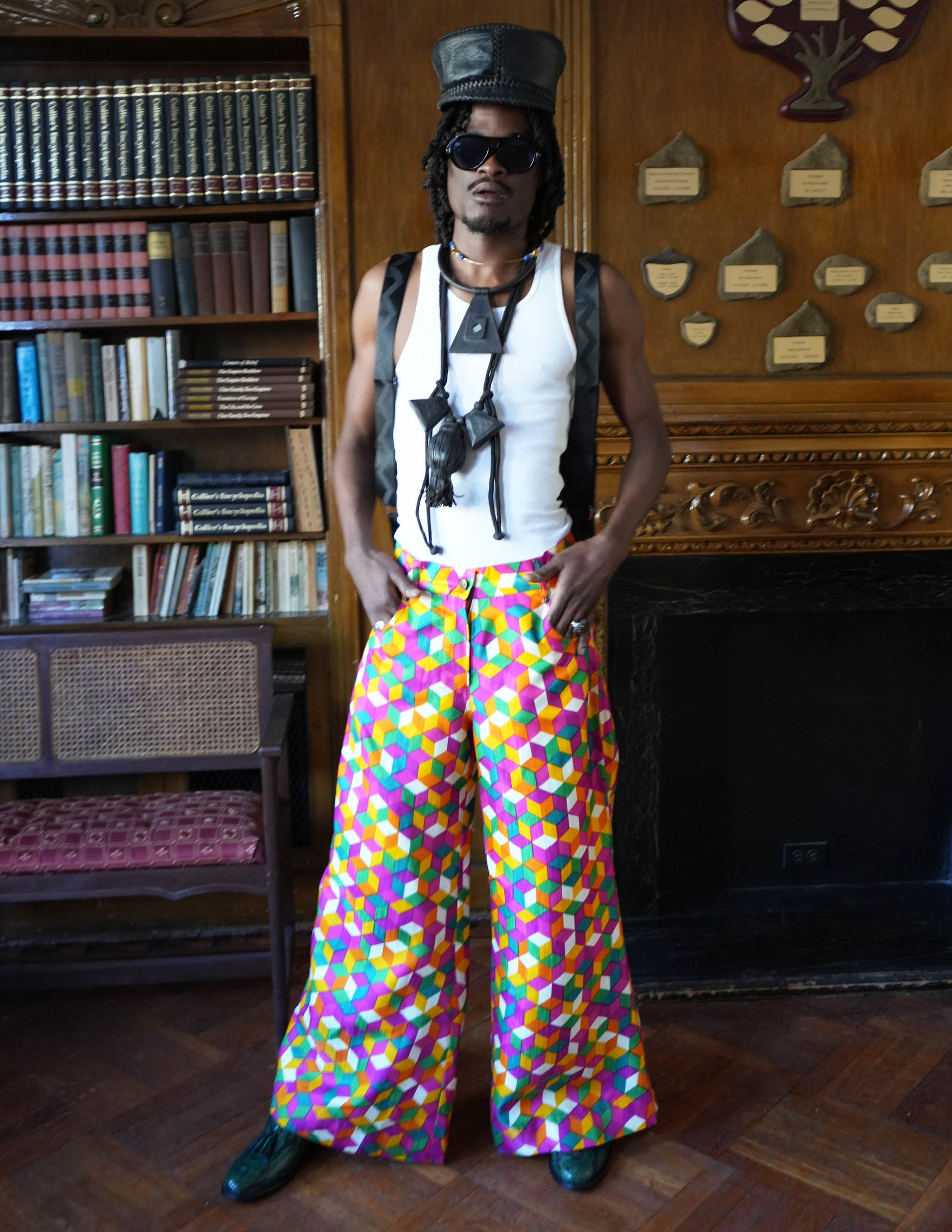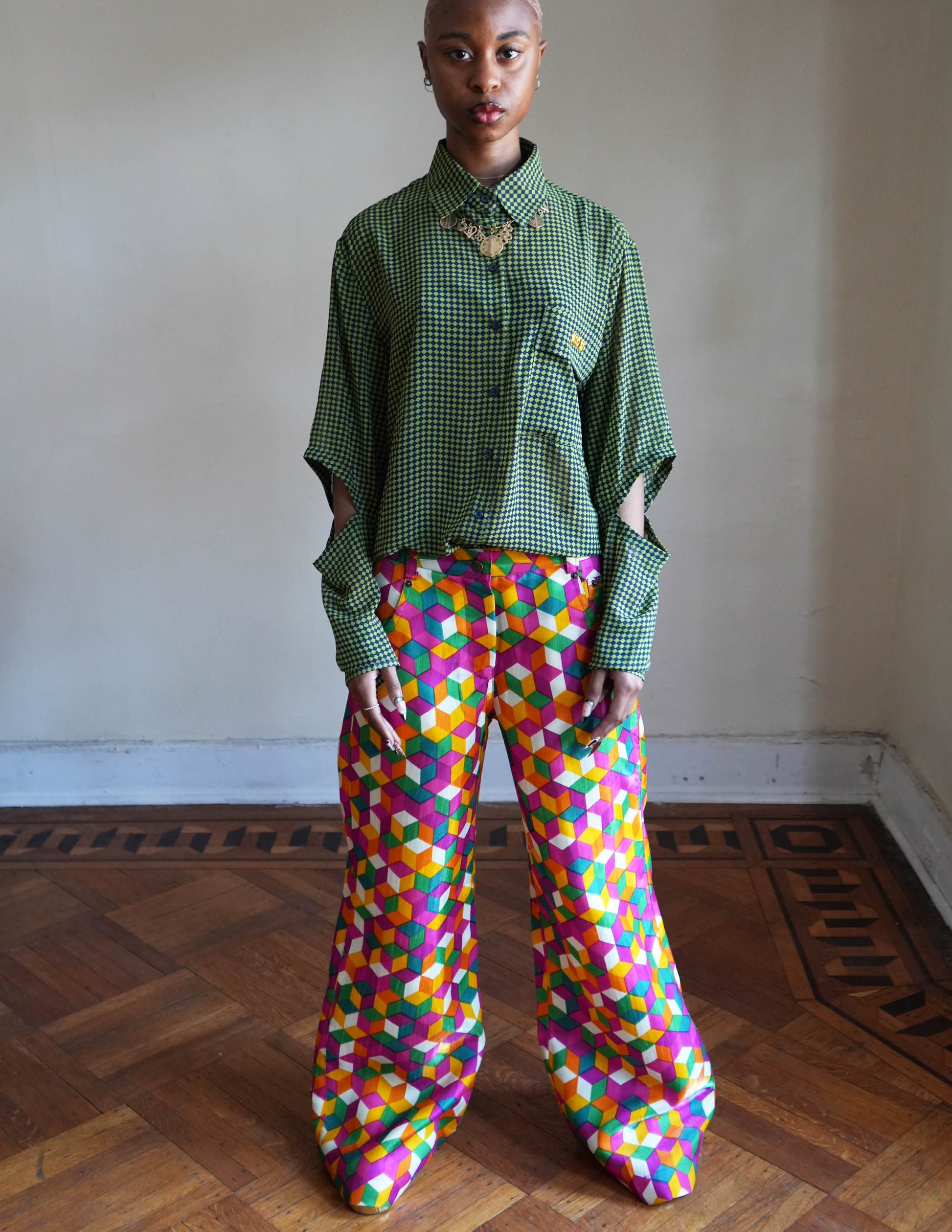 An extravagant moment, our Raver pants were made in Senegal from lustrous shantung fabric with a geometric pattern in vibrant pink, green, and yellow. They are designed with a high waist and fall to a fluid wide-leg for dynamic elegance.