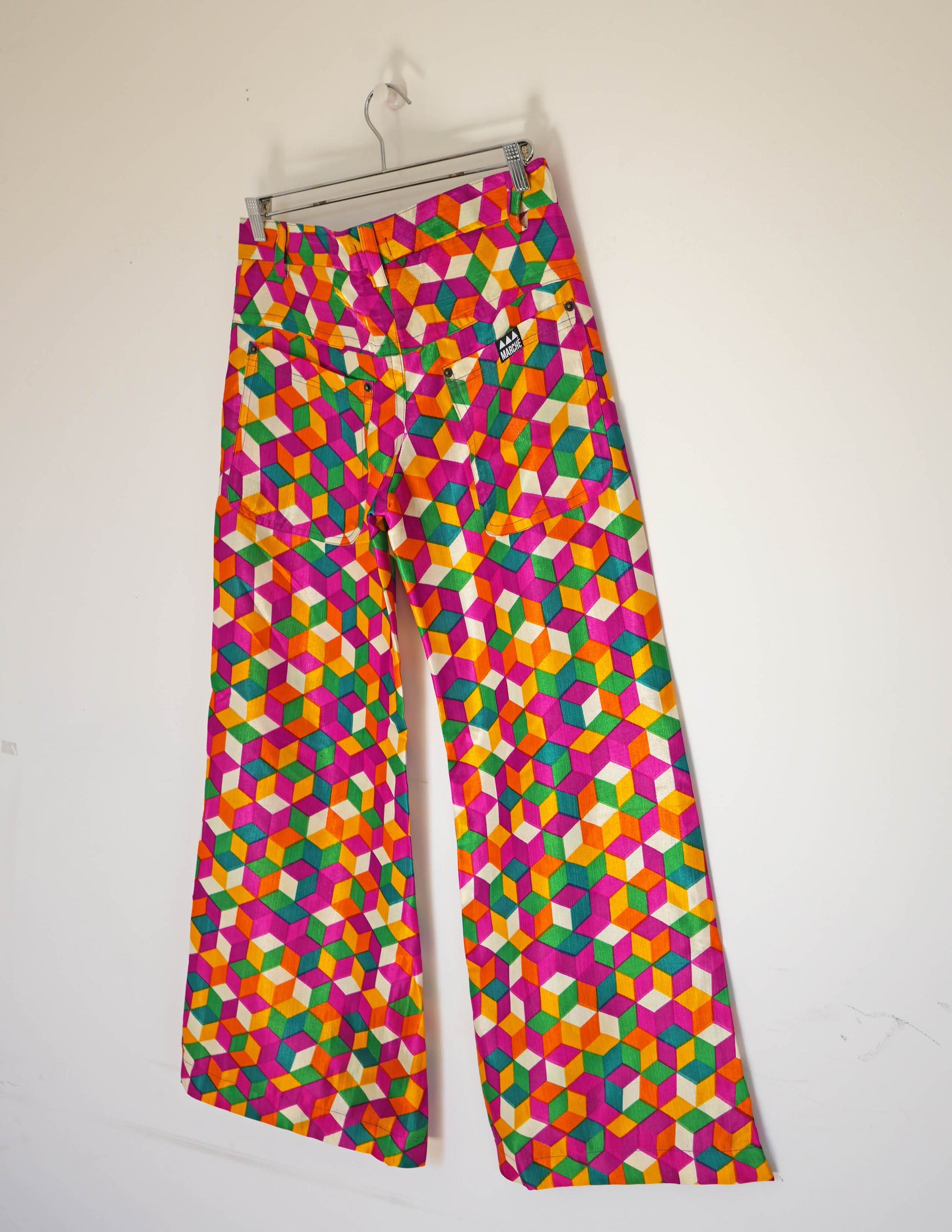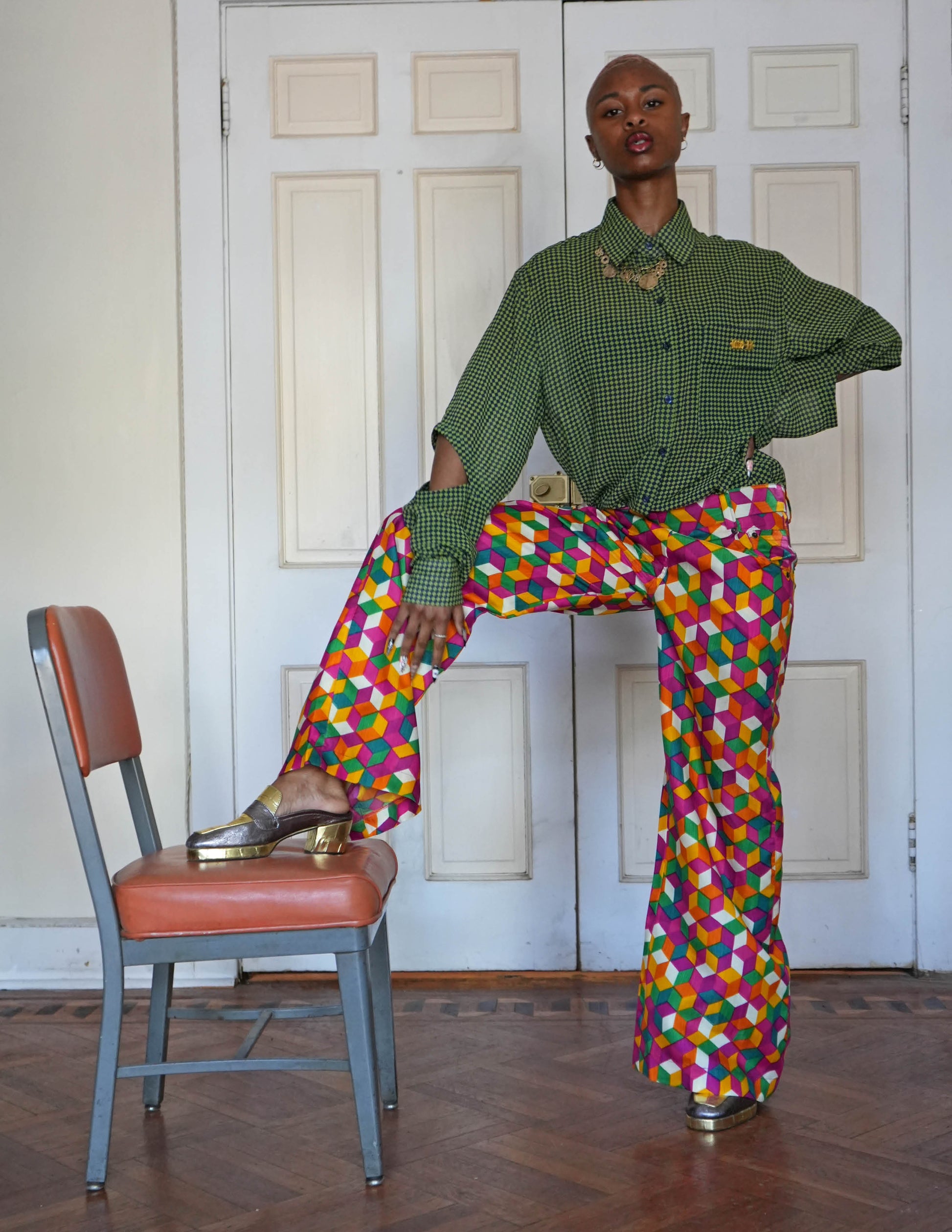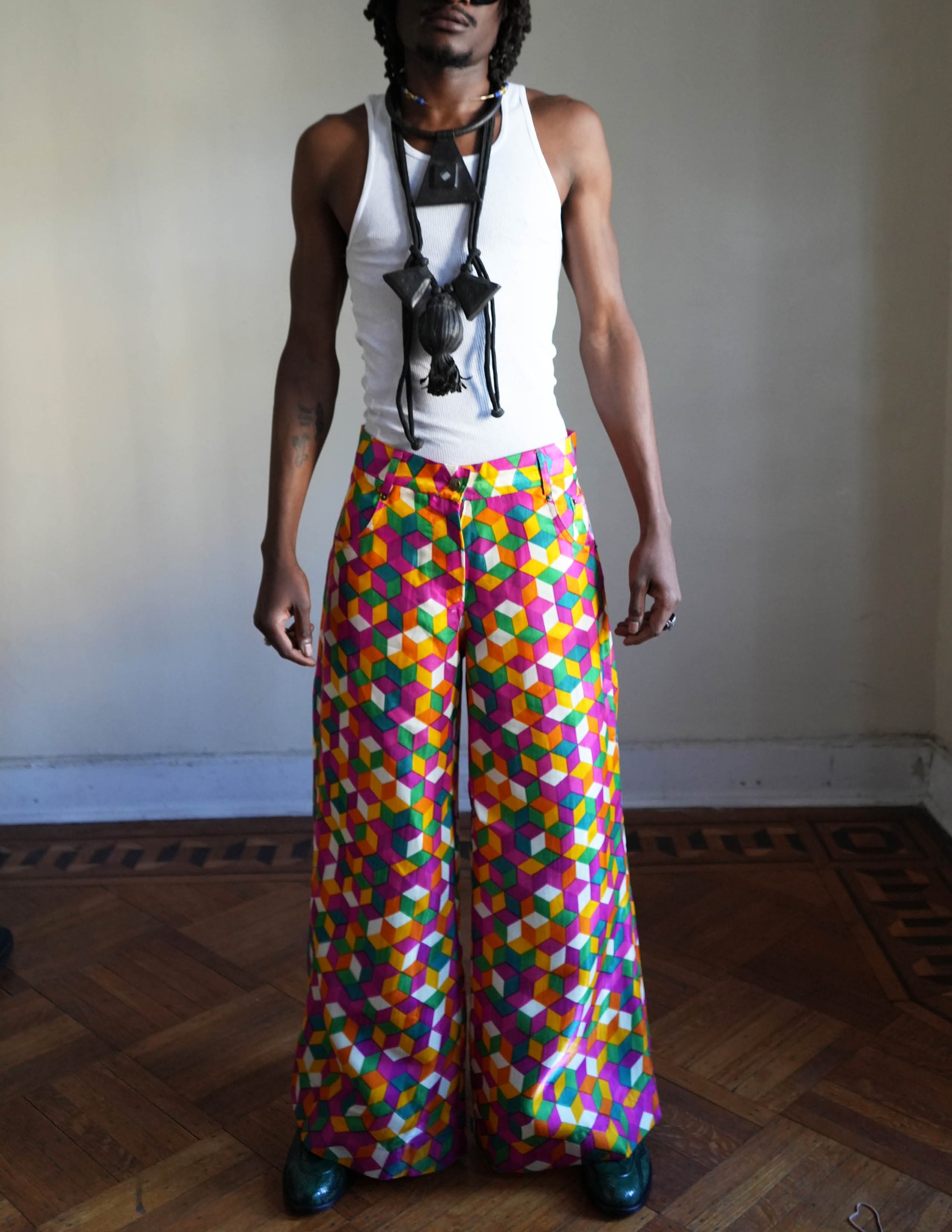 An extravagant moment, our Raver pants were made in Senegal from lustrous shantung fabric with a geometric pattern in vibrant pink, green, and yellow. They are designed with a high waist and fall to a fluid wide-leg for dynamic elegance.