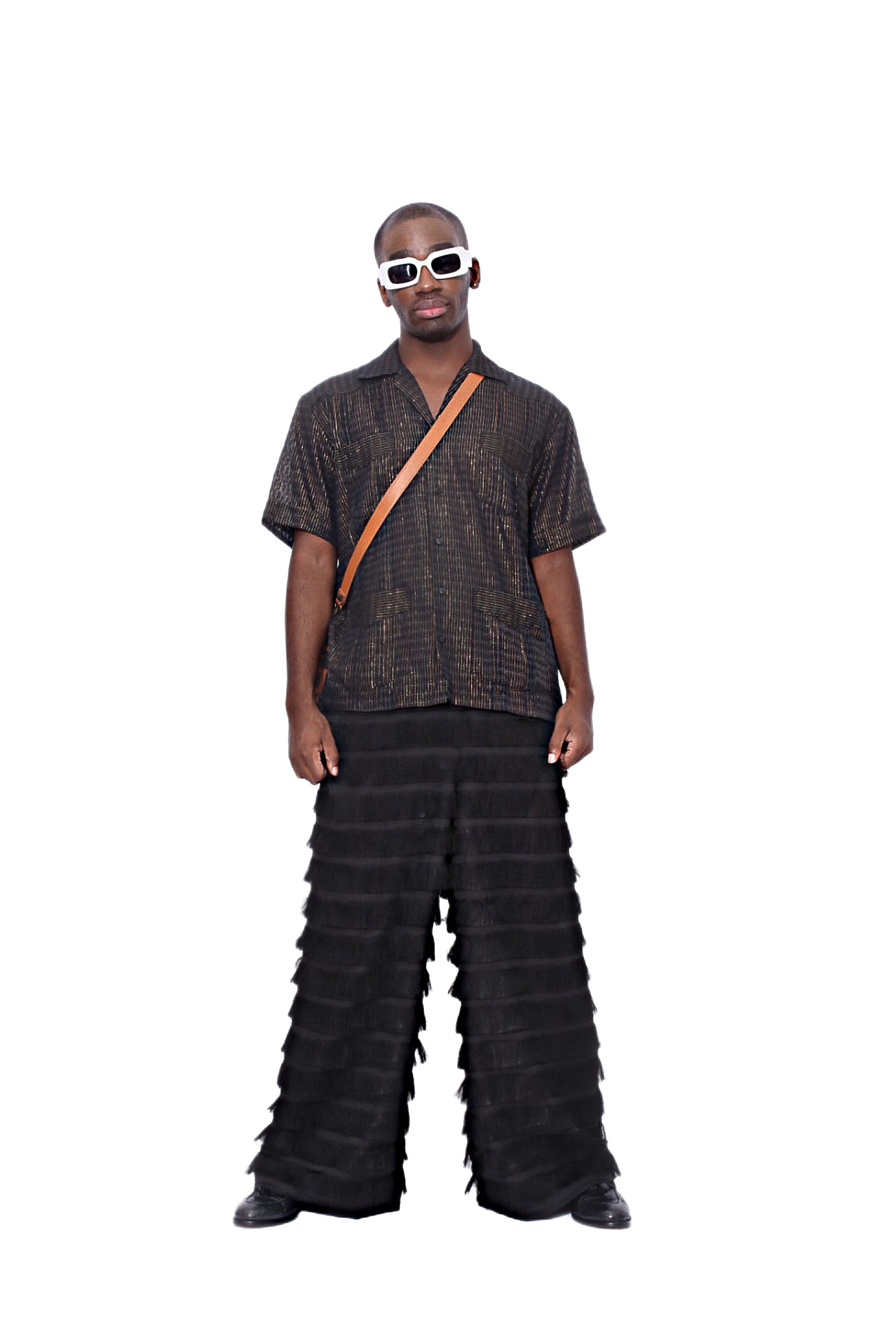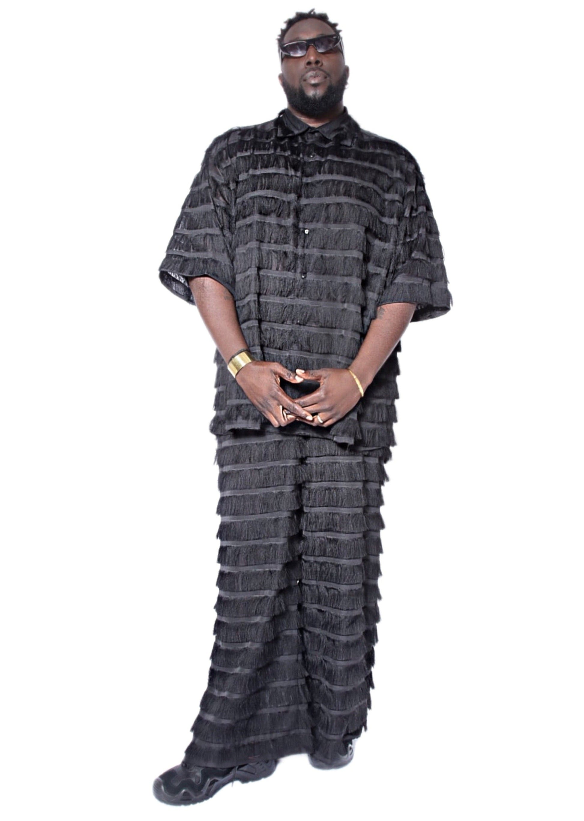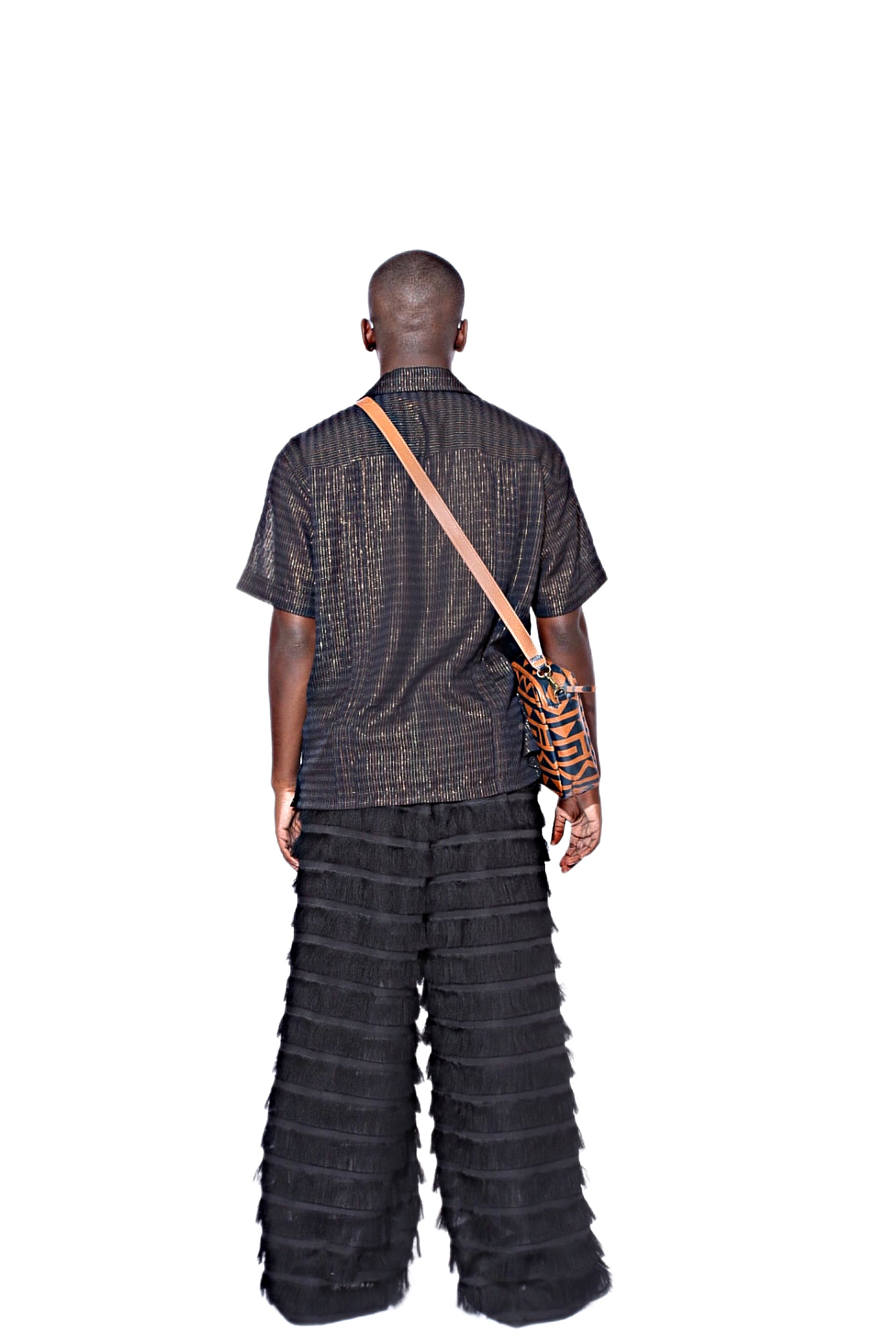 Our Moruf pants have a fluid, wide-leg silhouette cut from organza and illuminated with tiered fringe– the result of the skilled eye of Senegalese artisans. Pair with our matching Moruf shirt for fierce coordination.