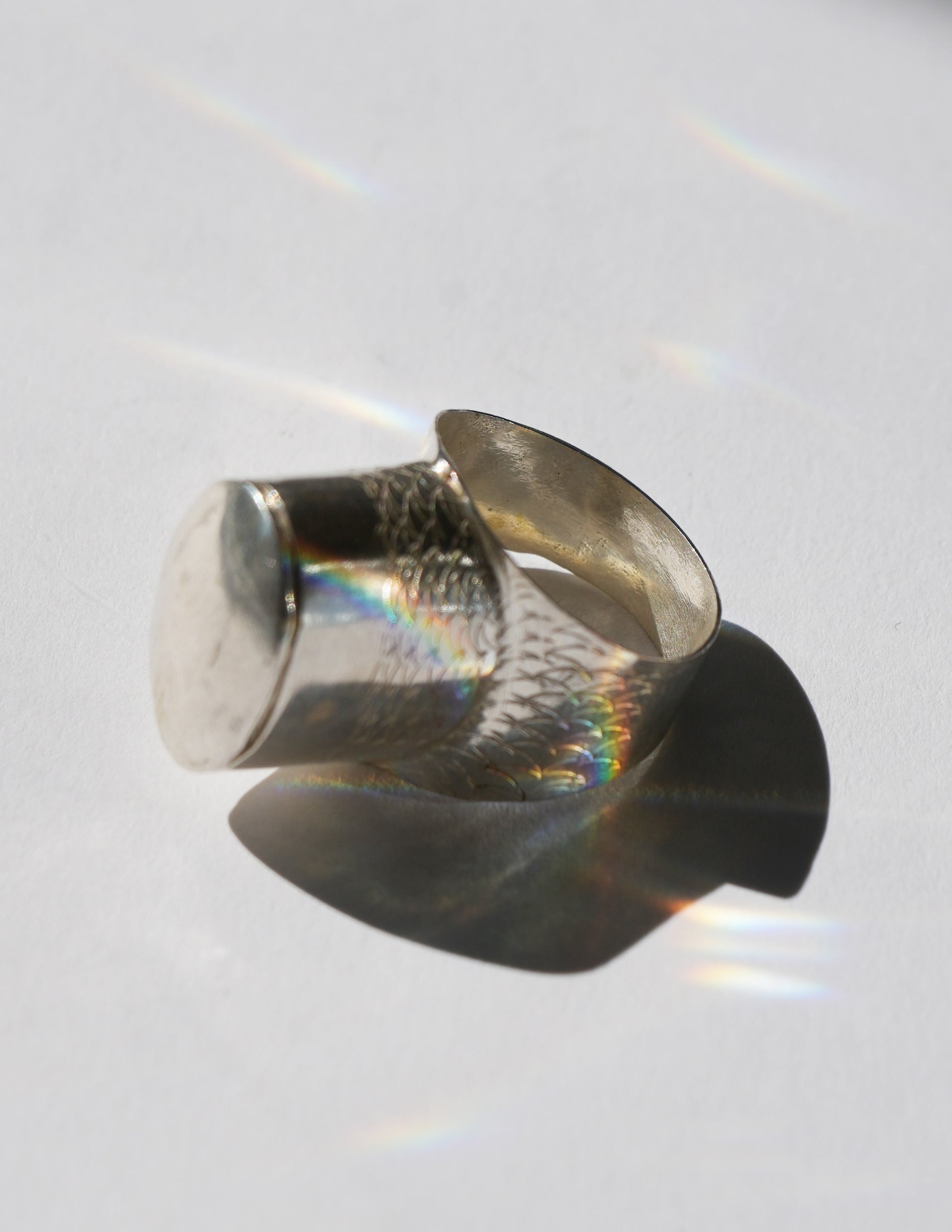 This Sterling silver ring is oval-shaped and etched delicately with traditional Senegalese designs. The upper portion opens to house a secret stash of good vibes and prayers.