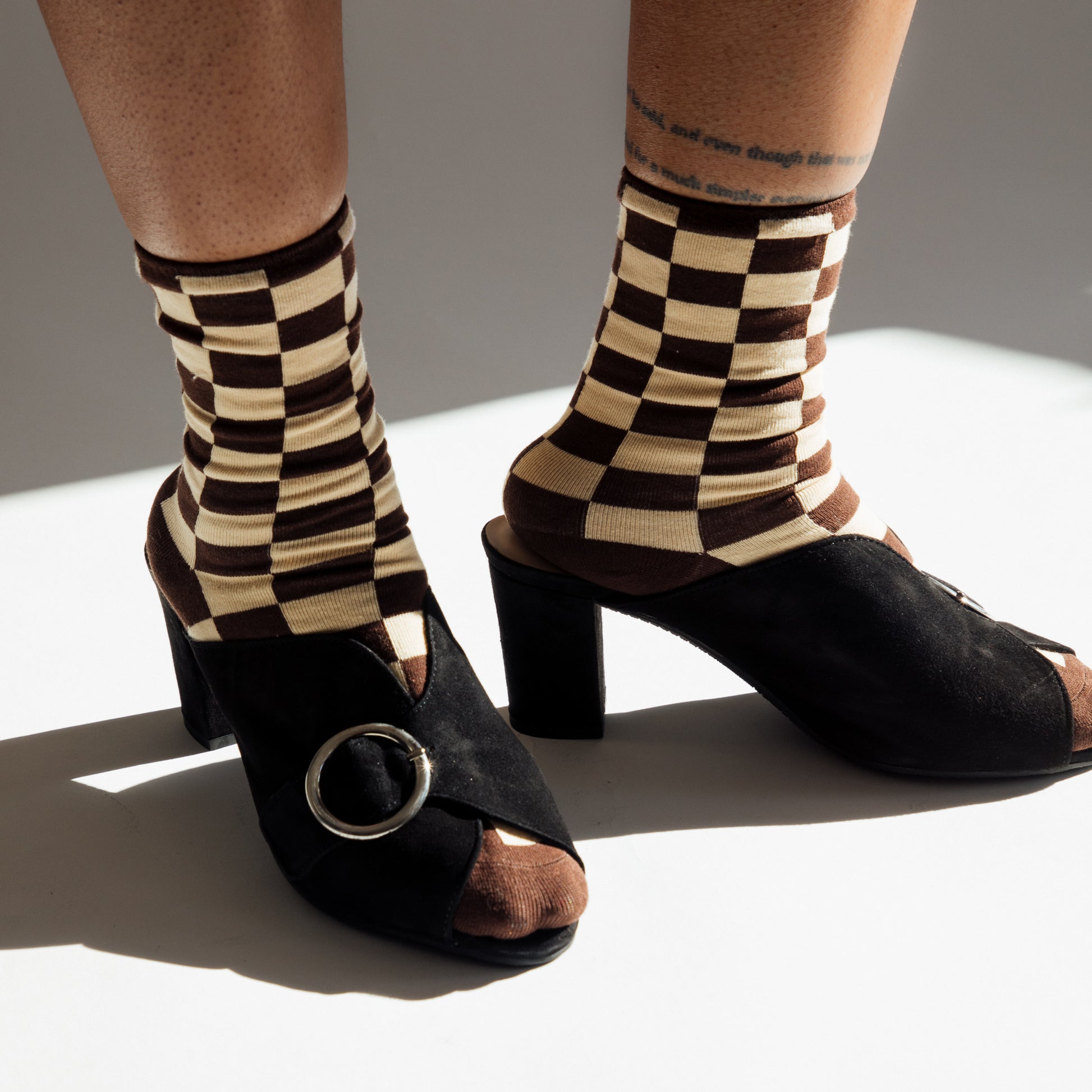 Black suede open toe mules with buckle.