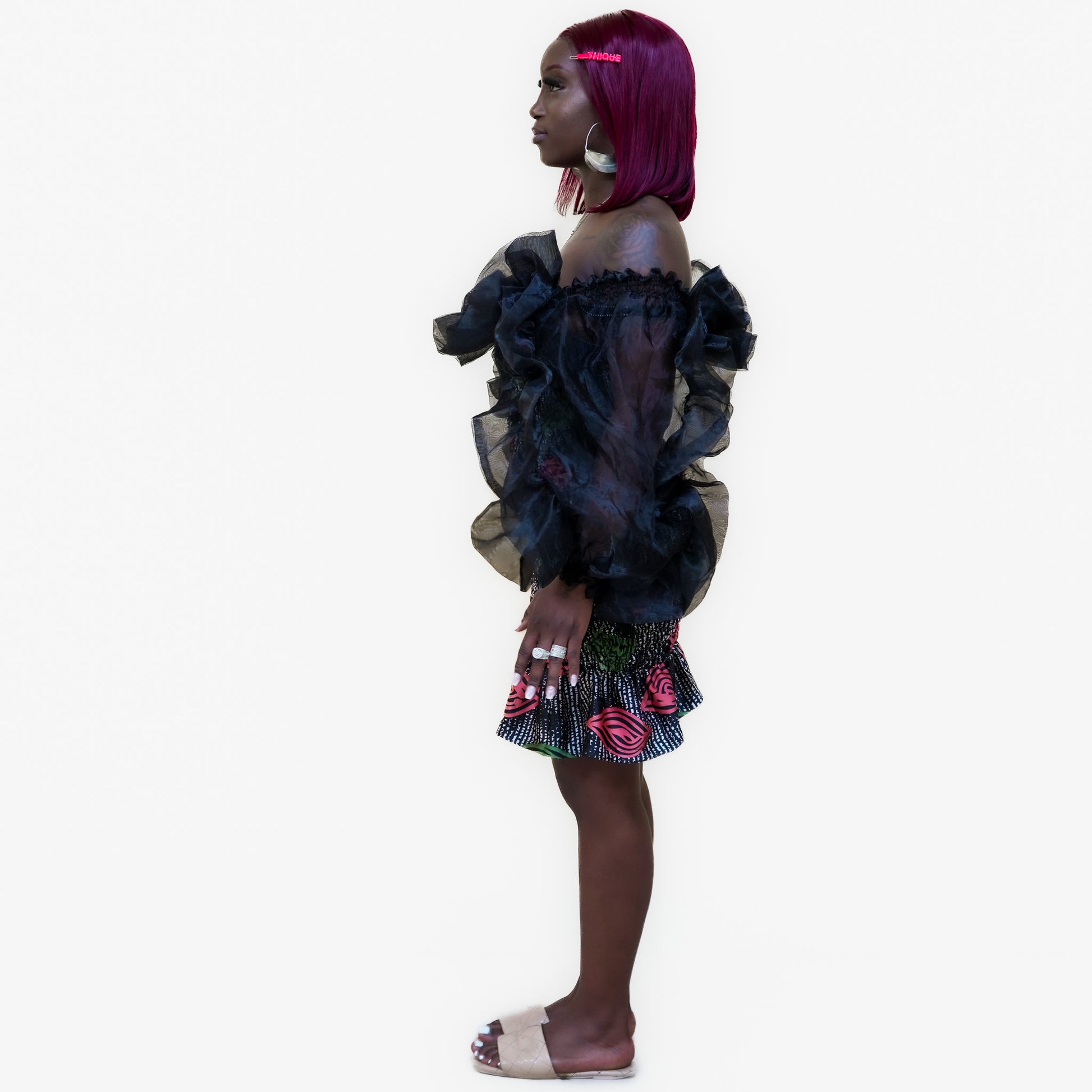 Decorated with wild ruffles and vibrant roses, this Ouli mini dress is bound to make a statement wherever you go. It was handmade in Benin with a generous amount of stretch, has an elastic shoulder-flaunting neckline, and accentuates every curve before falling to an uneven ruffled hem.
