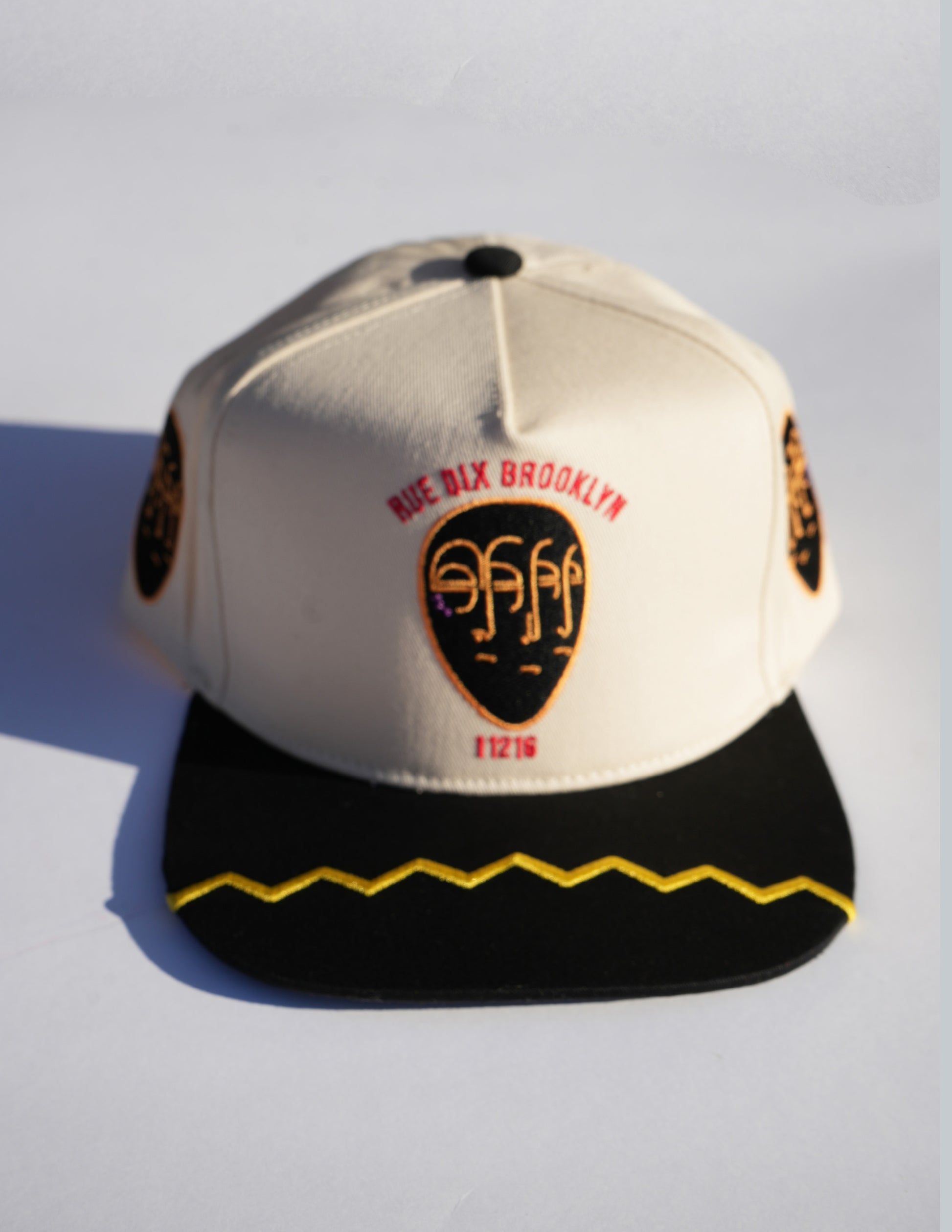 Our Rue Dix Mask Baseball Cap is embroidered with top craftsmanship. It features our mask logo, palm logo, and zigzag stitched bill.