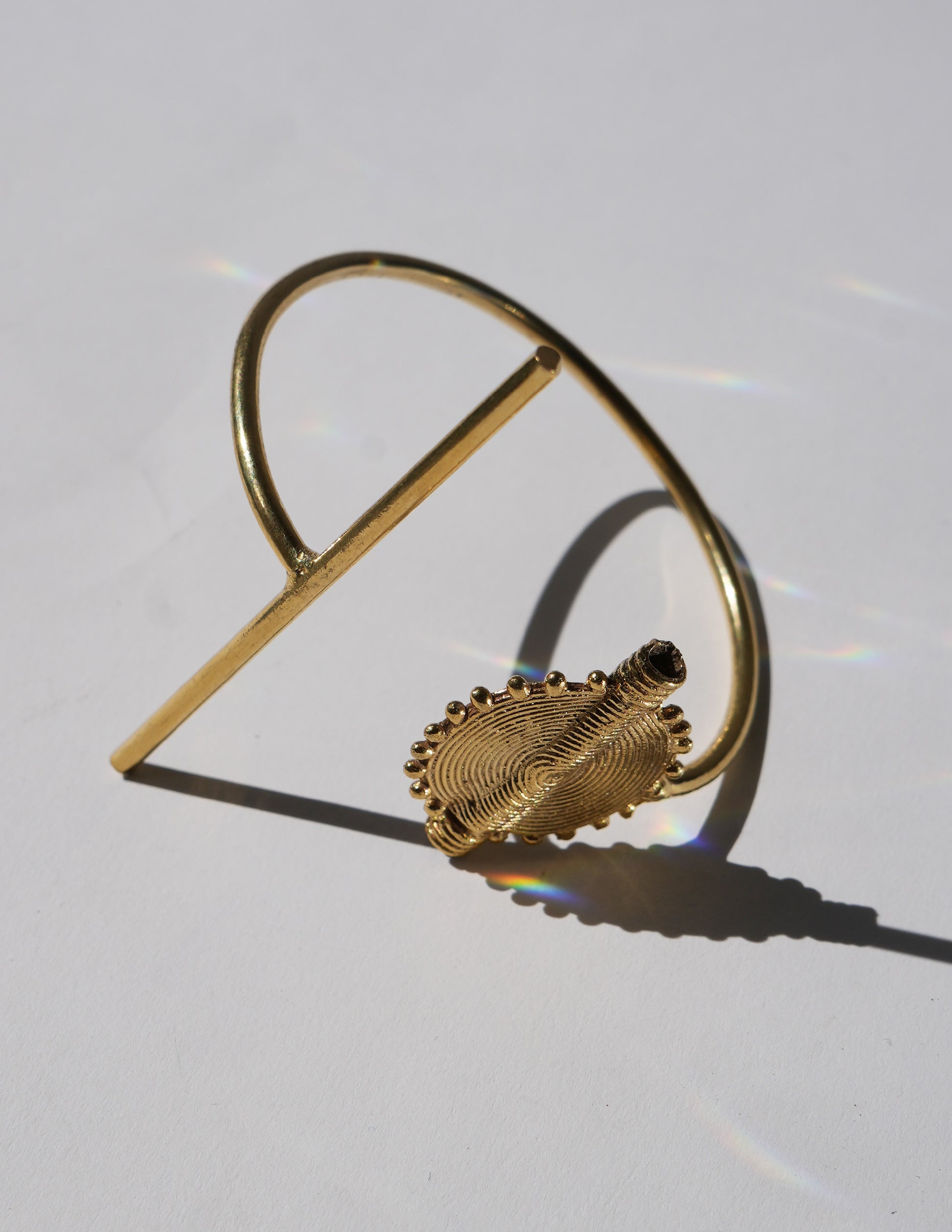 Gold-plated brass cuff, adjustable with a shield emblem at the opening.