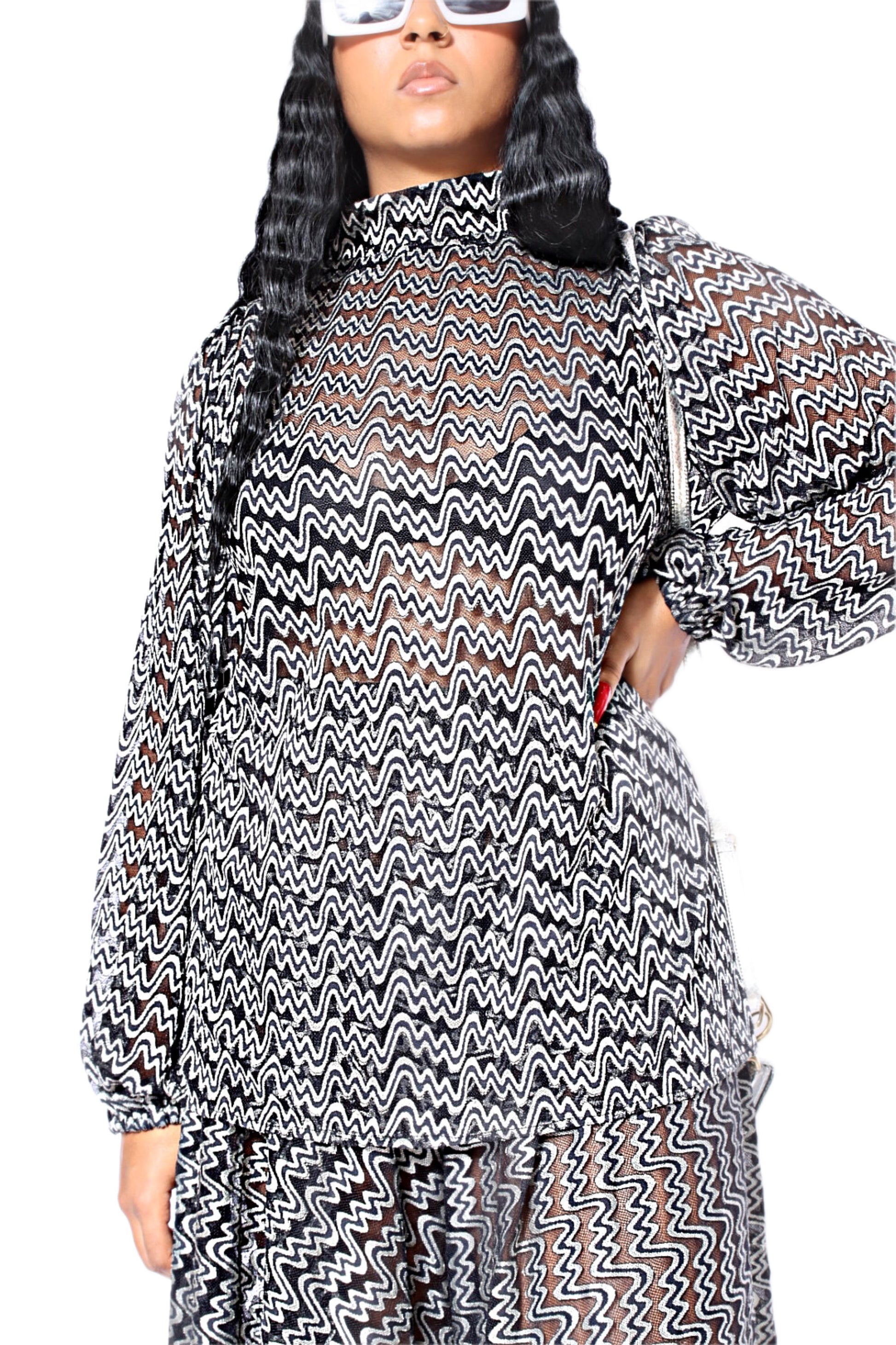 Sometimes you need a retro moment. Expertly crafted by Senegalese artisans, our Skyy Squiggle top is made from delicate black and silver corded lace with a fluid silhouette and cinched cuffs for elegant definition. Tuck yours into our Skyy Squiggle pants.