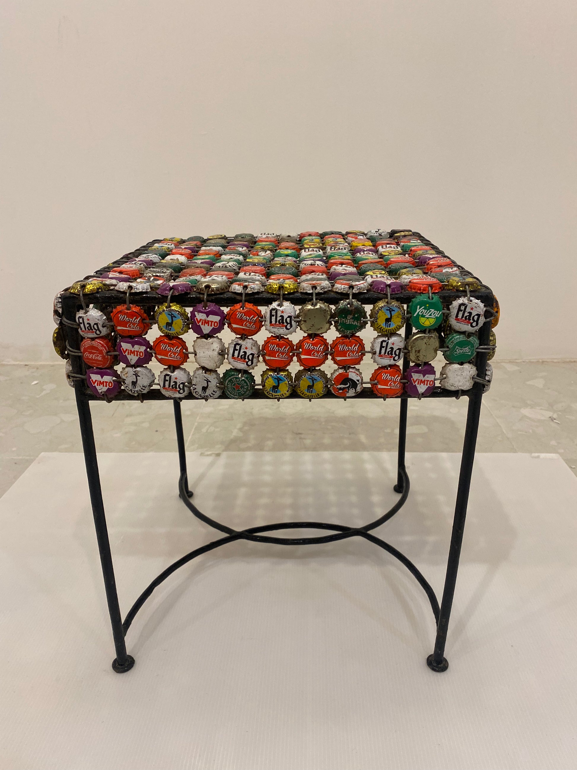 This decorative table is crafted from bottle caps by a Senegalese artist.