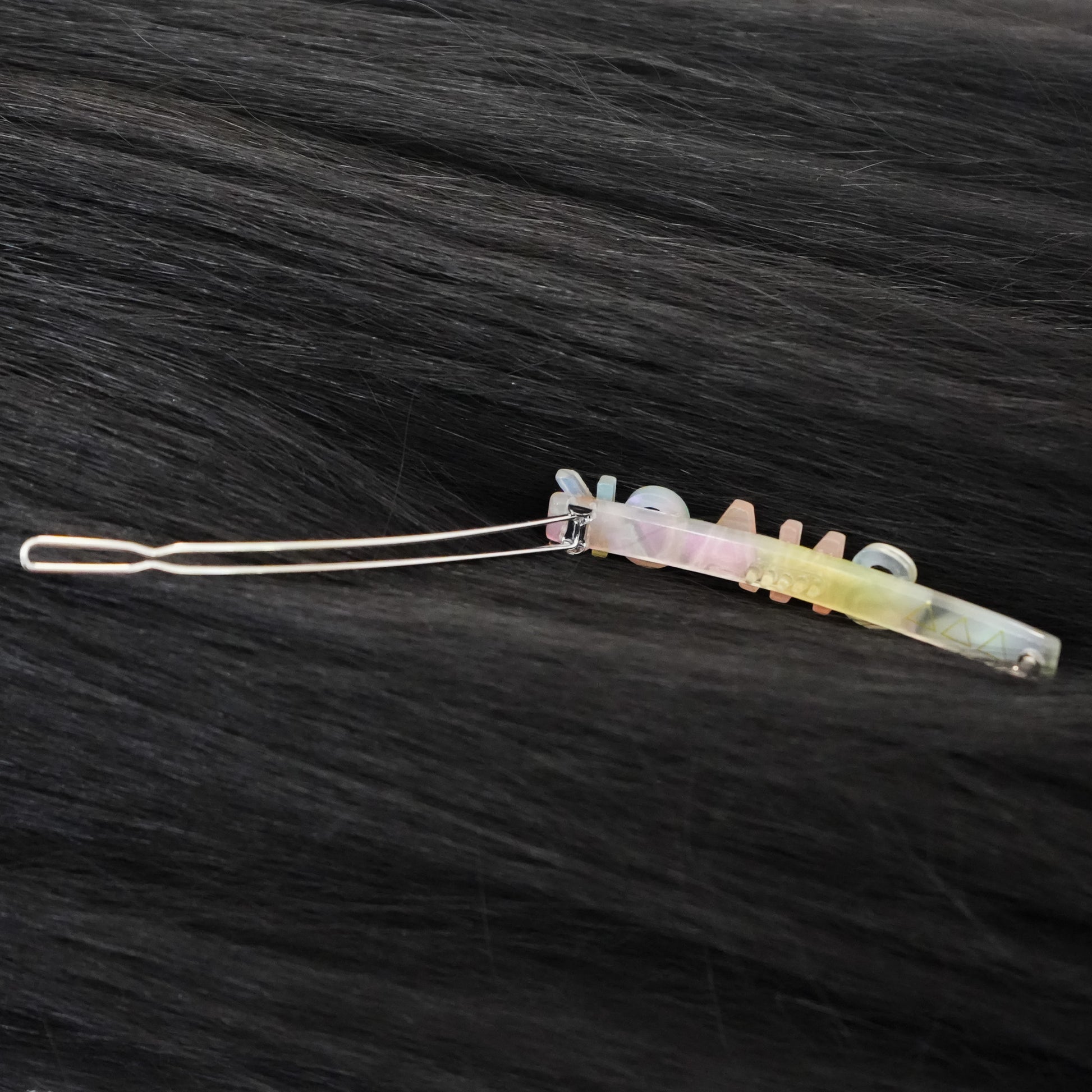 A multi-colored, plastic hair clip with hinged closure. 7cm.