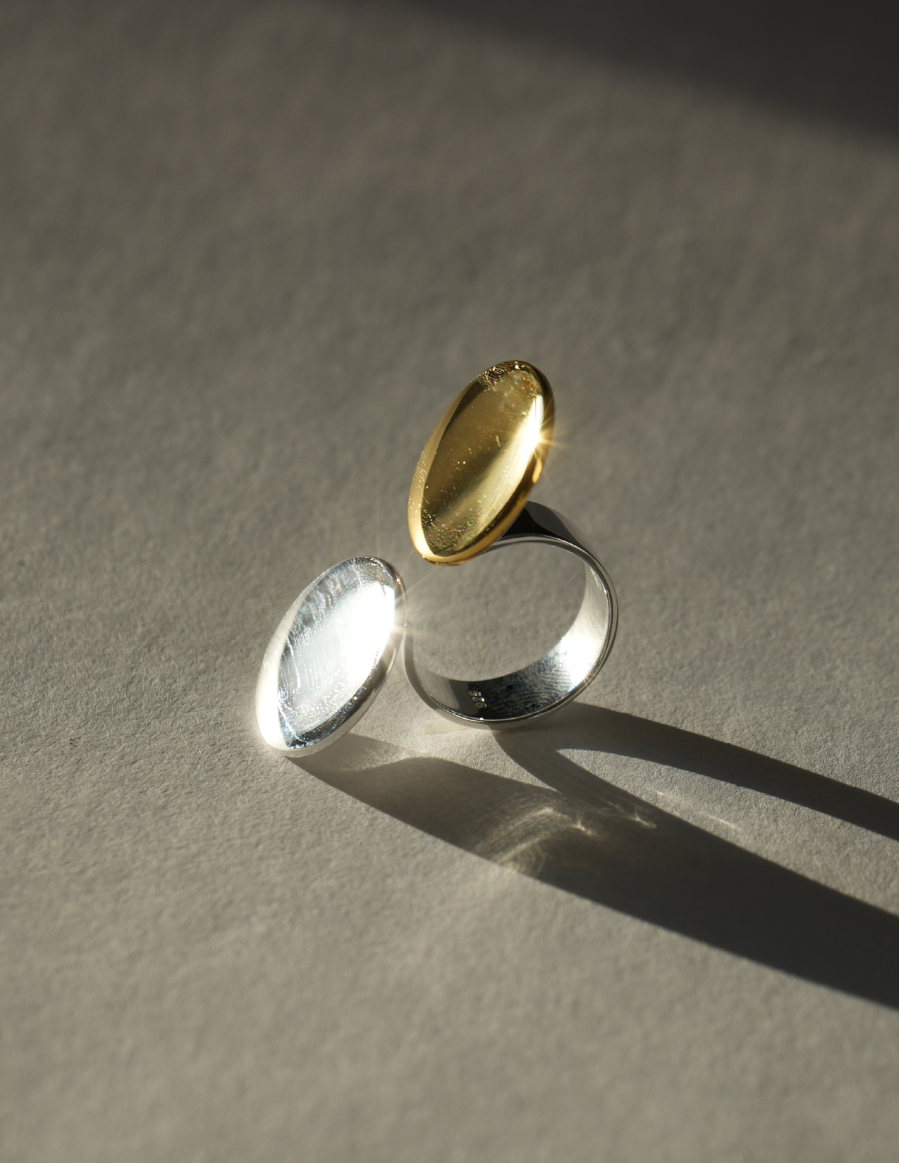 Explore sophistication with our Split Top Two-Toned Disc Ring from the Disaporan Voyage Collection made in collaboration with Chee Lee Designs. This ring features a captivating two-toned disc design with true harmony and unity. The split top adds a touch of contemporary flair. It is a versatile accessory that effortlessly complements any look. This statement ring that speaks volumes in its simplicity.