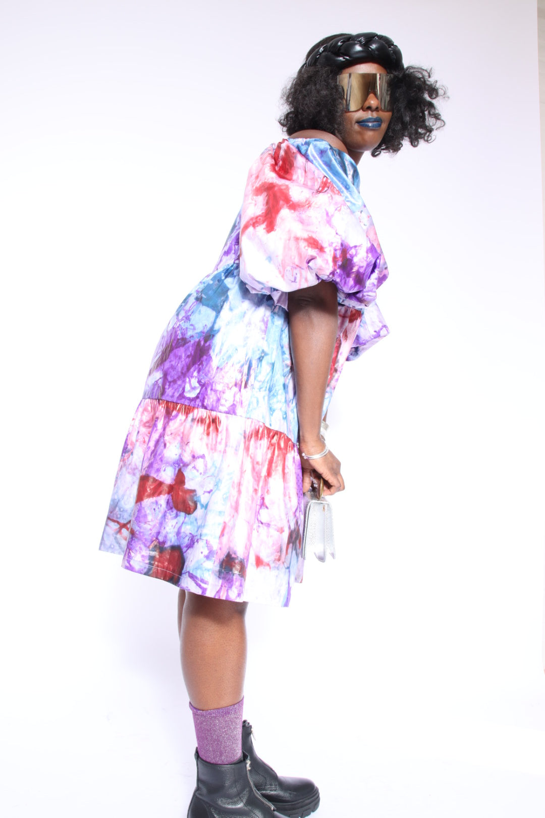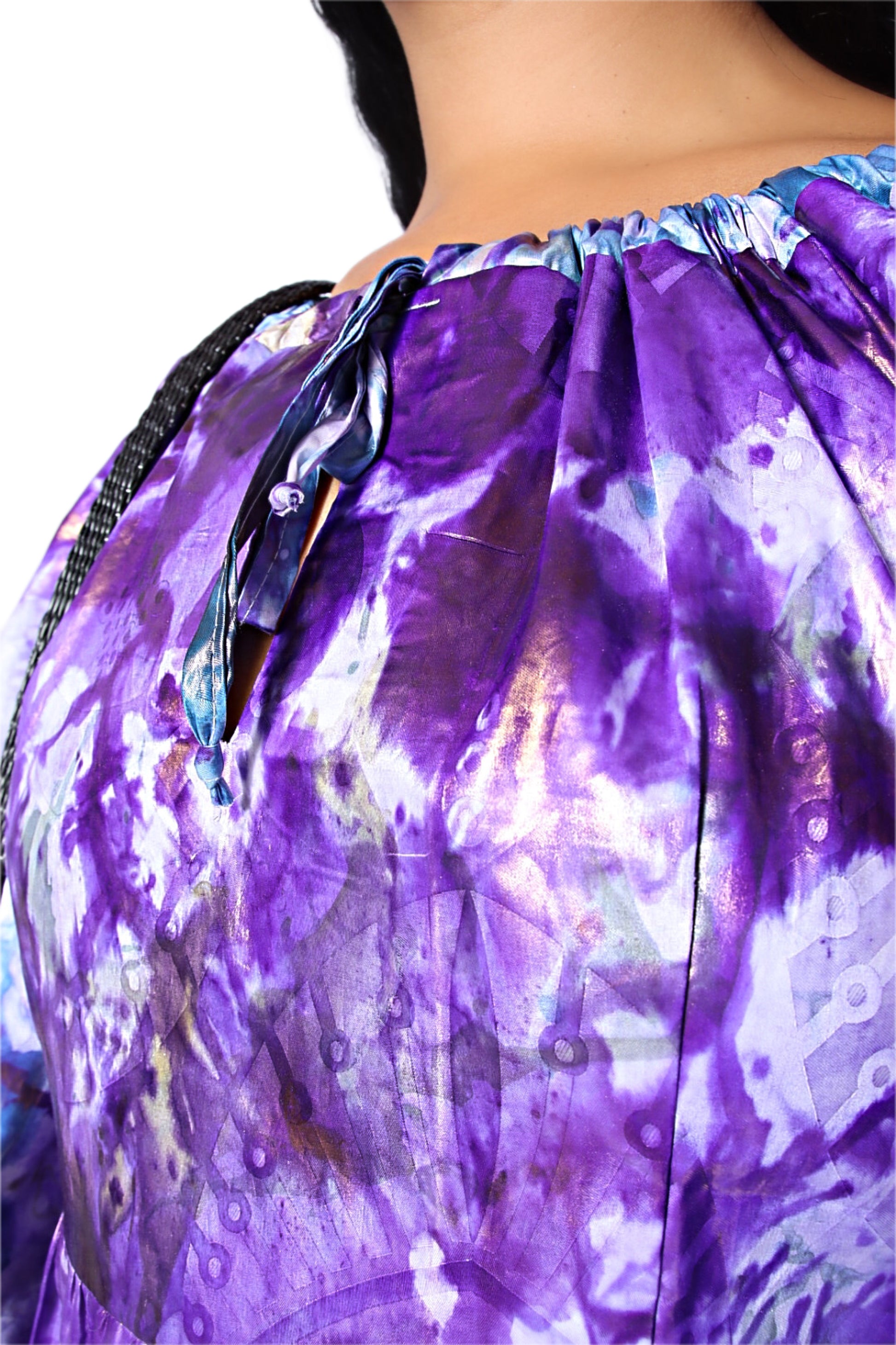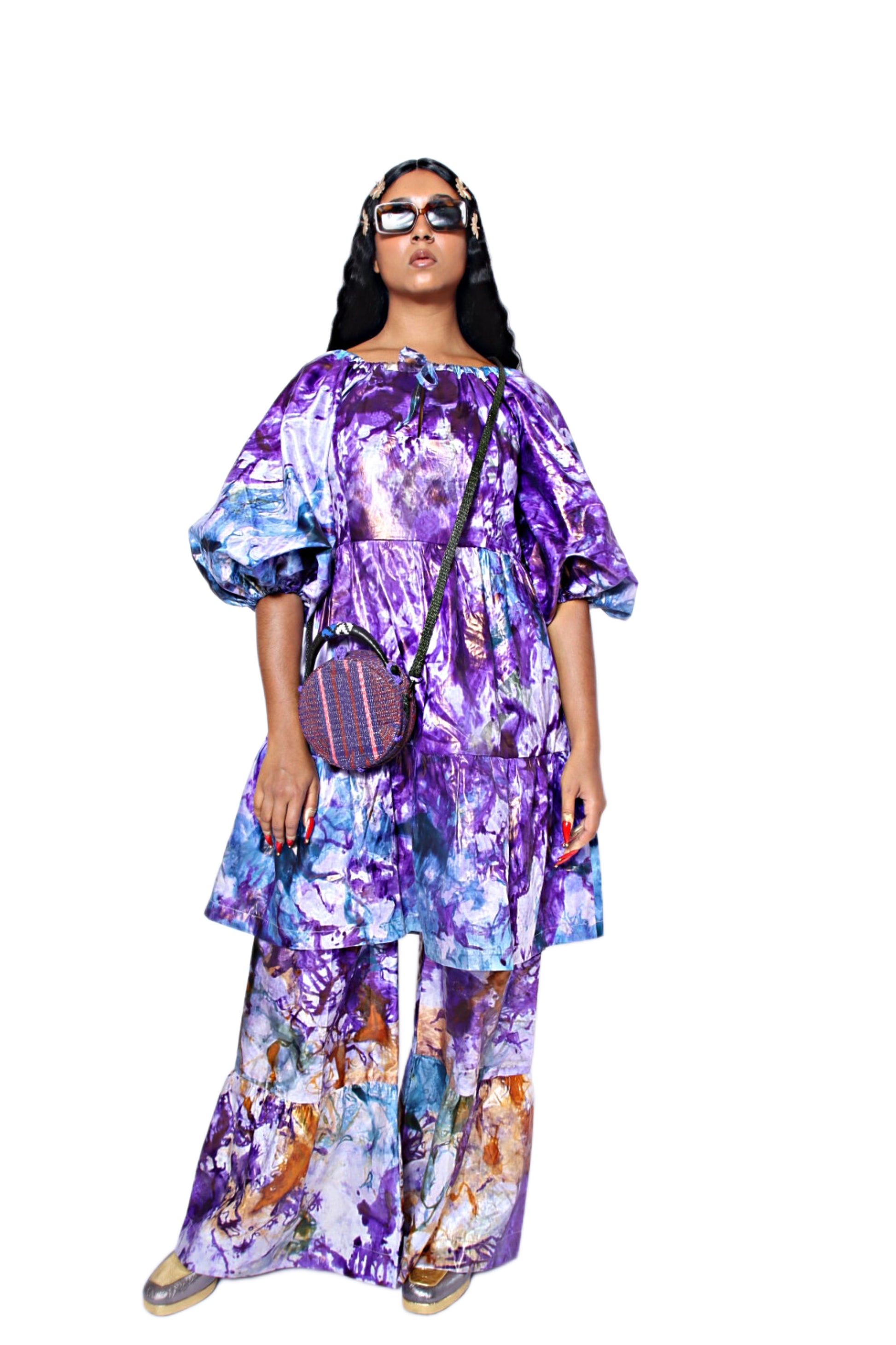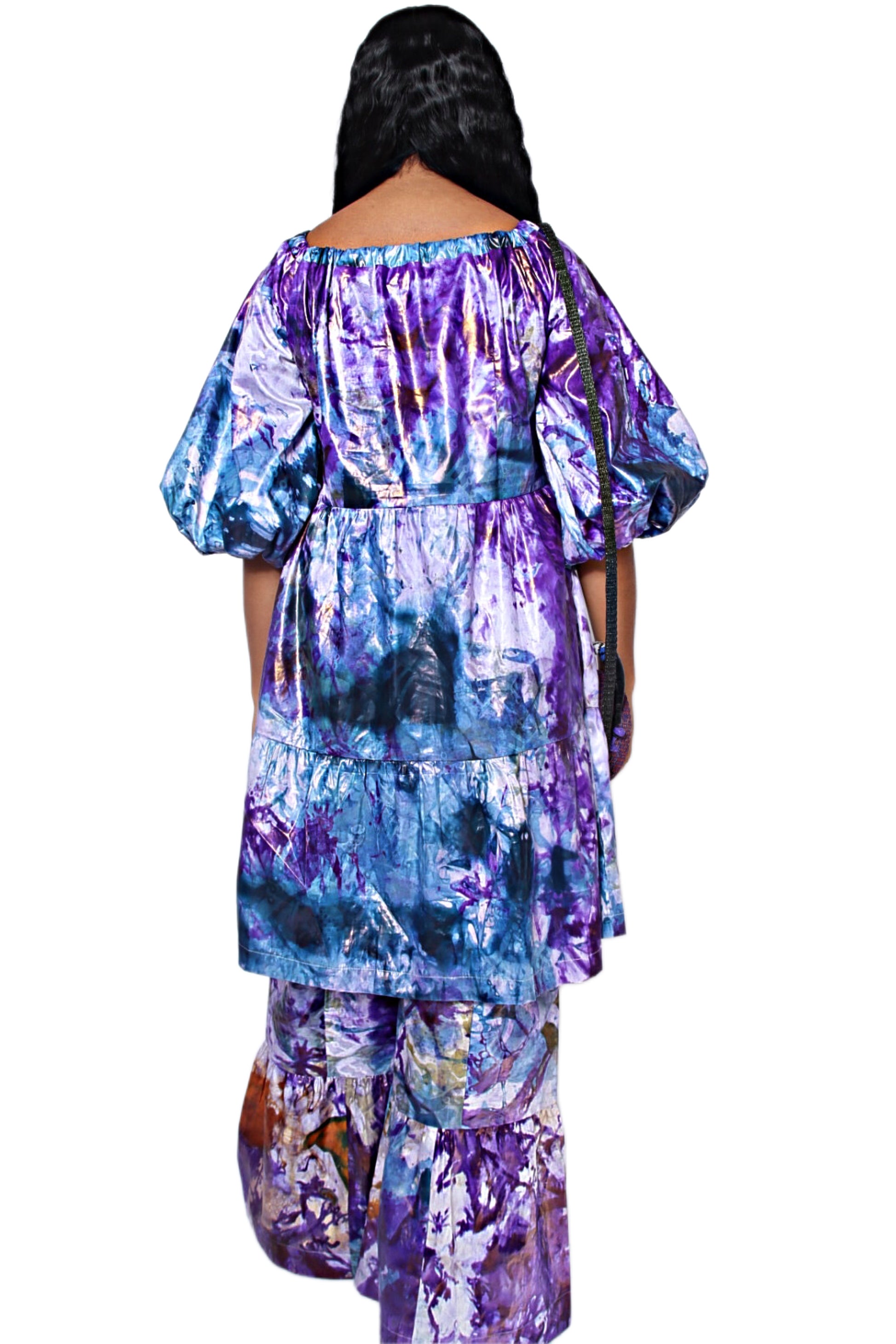 Our lavish Thioupe dress was made in Senegal from bazin– a decorative type of jacquard that’s intricately hand-dyed and has a lustrous sheen. It’s splashed with hypnotic, watercolor-inspired hues and has voluminous sleeves before flowing to a tiered silhouette for carefree opulence.