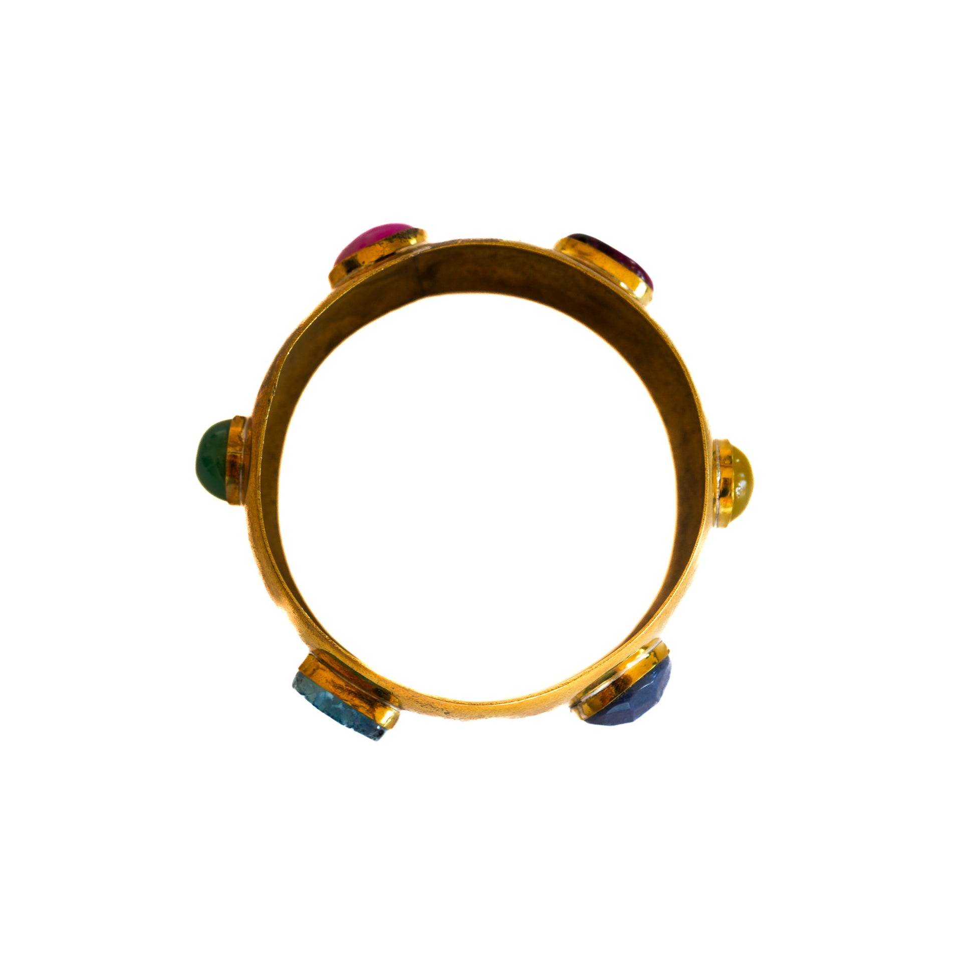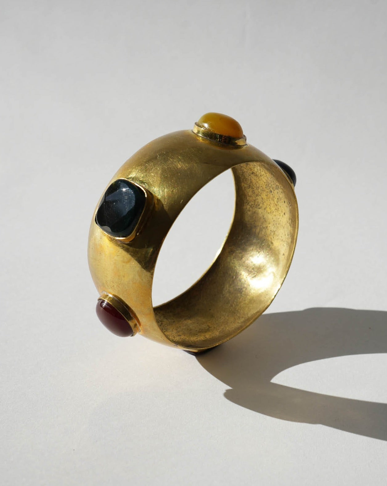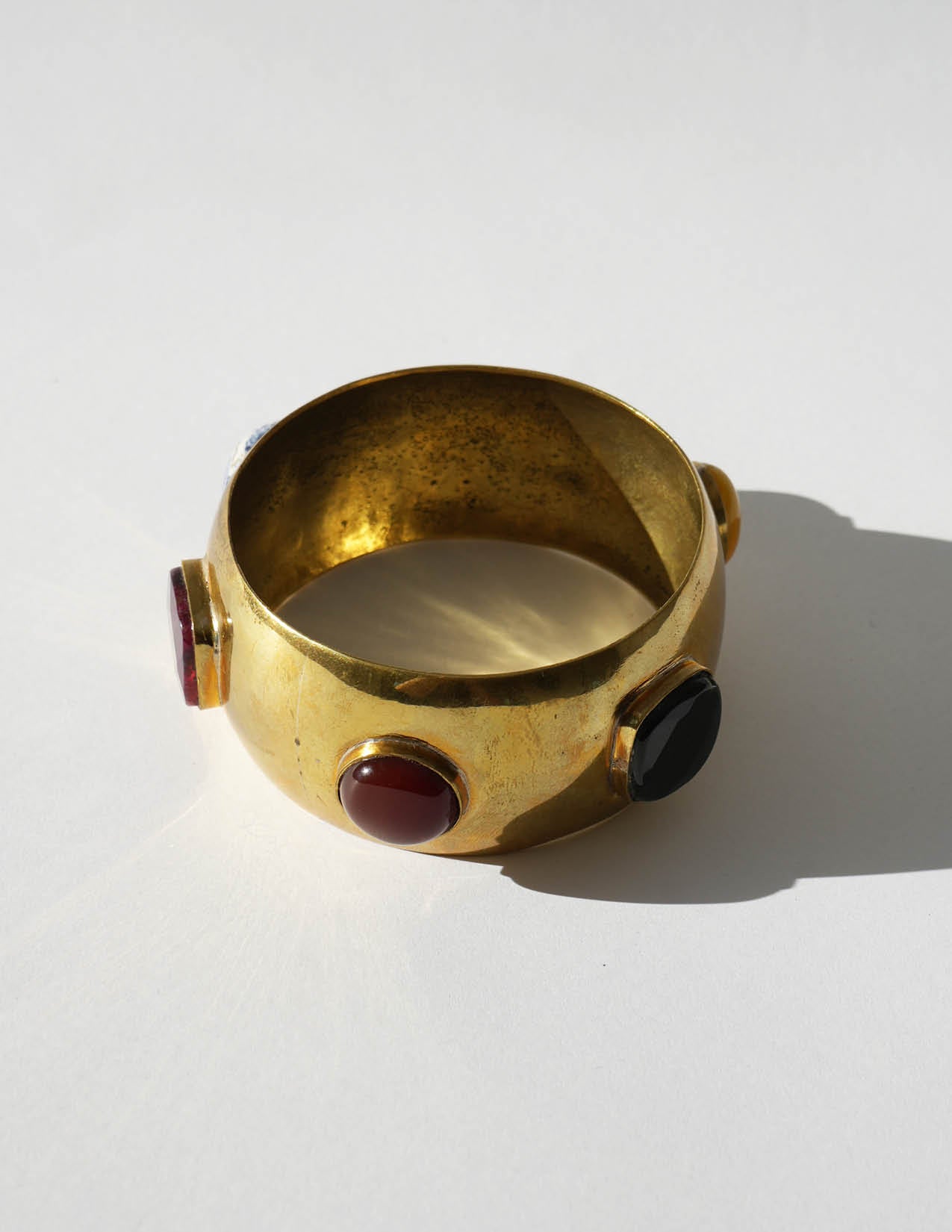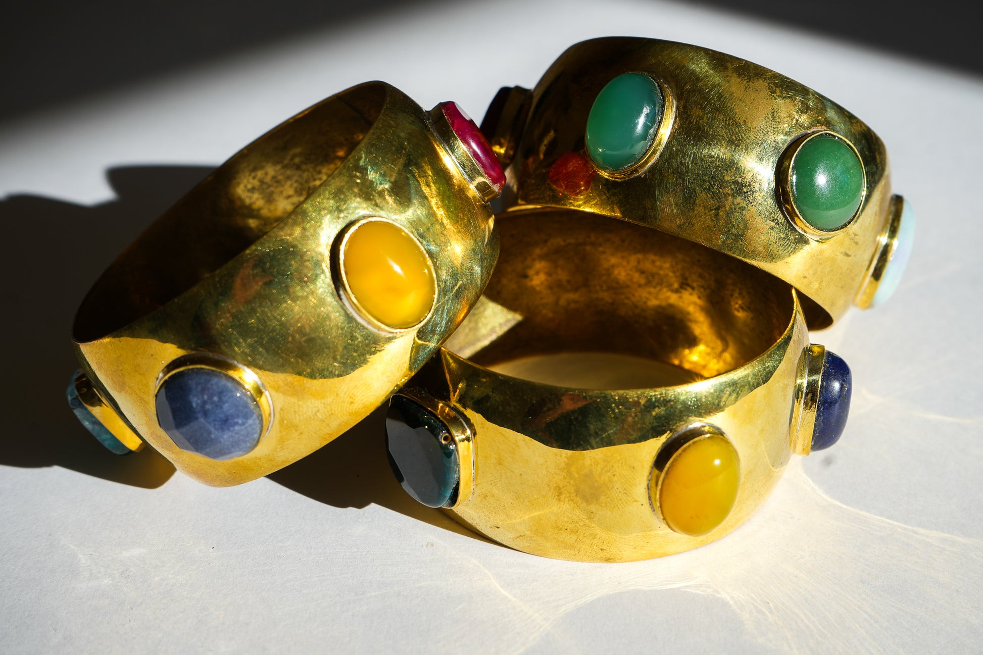 Inlaid with gleaming gemstones, our L'Artisane-designed cuff was handcrafted by Senegalese artisans from brass and carefully burnished with a vintage-inspired finish for distinctive bling.