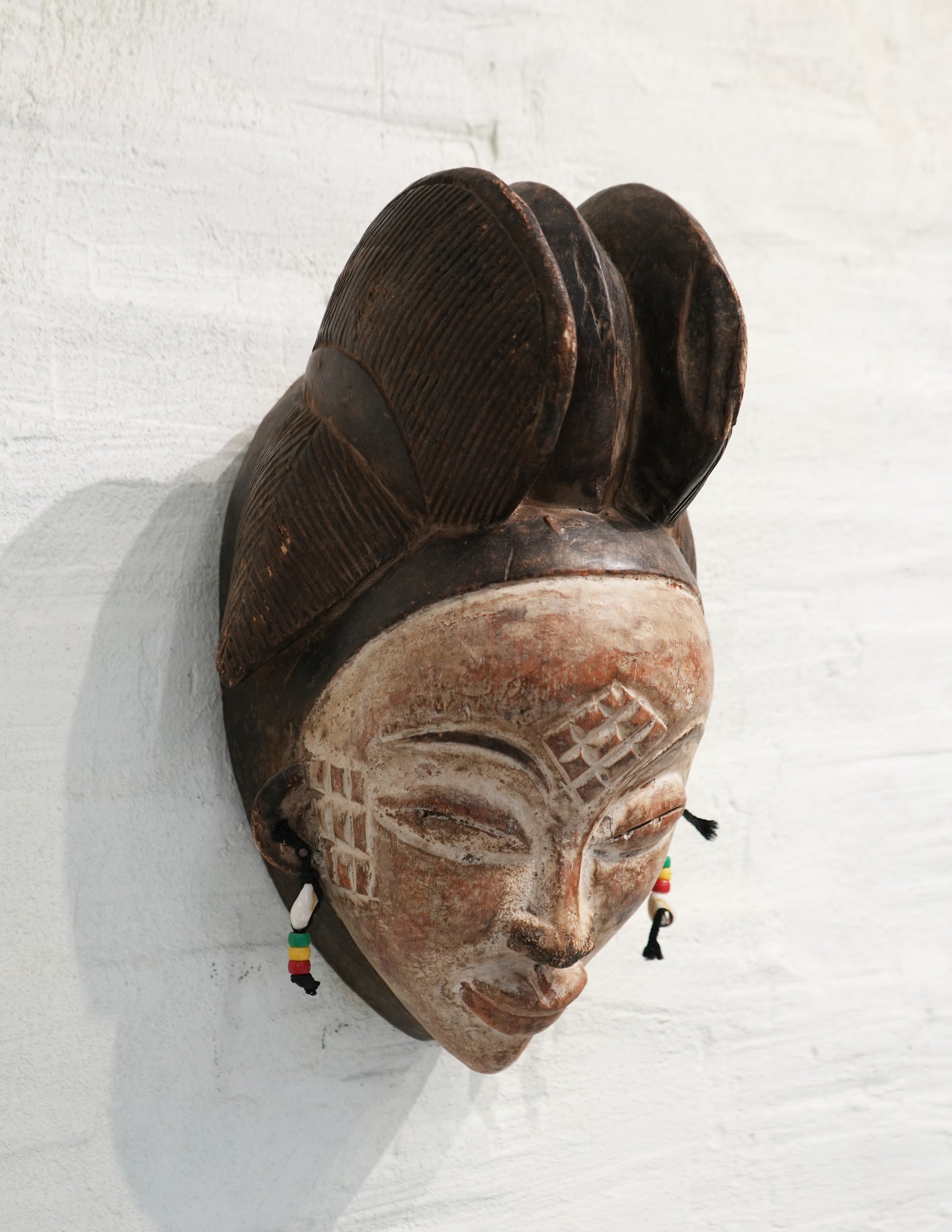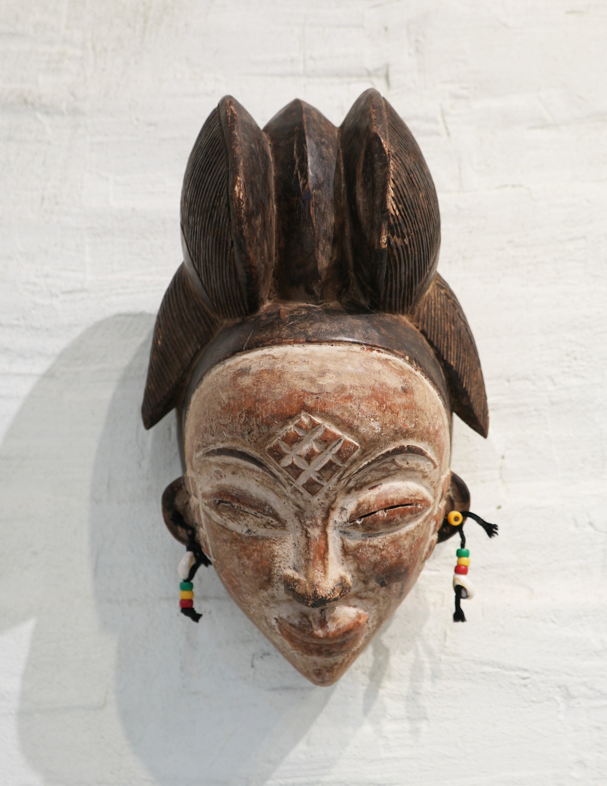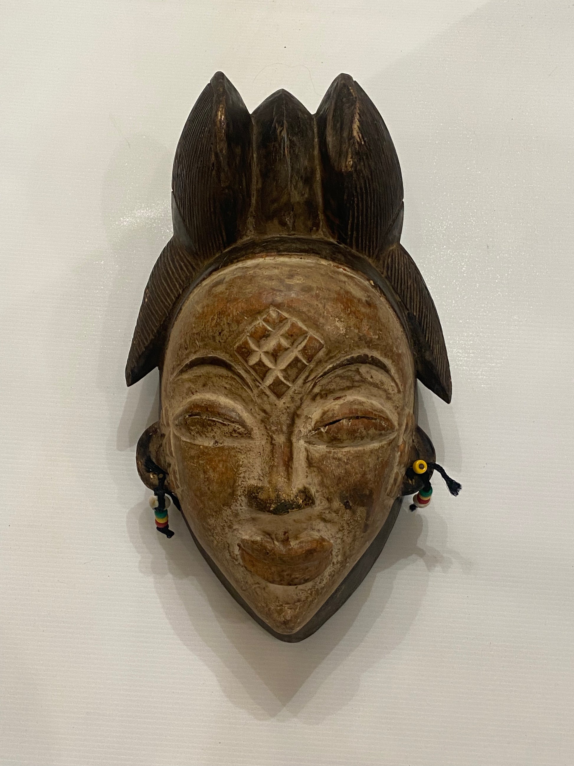 wooden face mask with earrings
