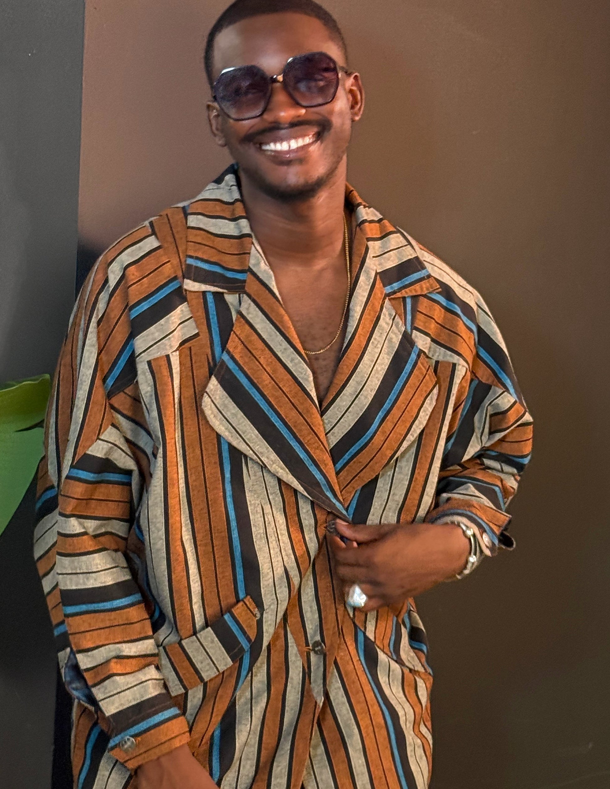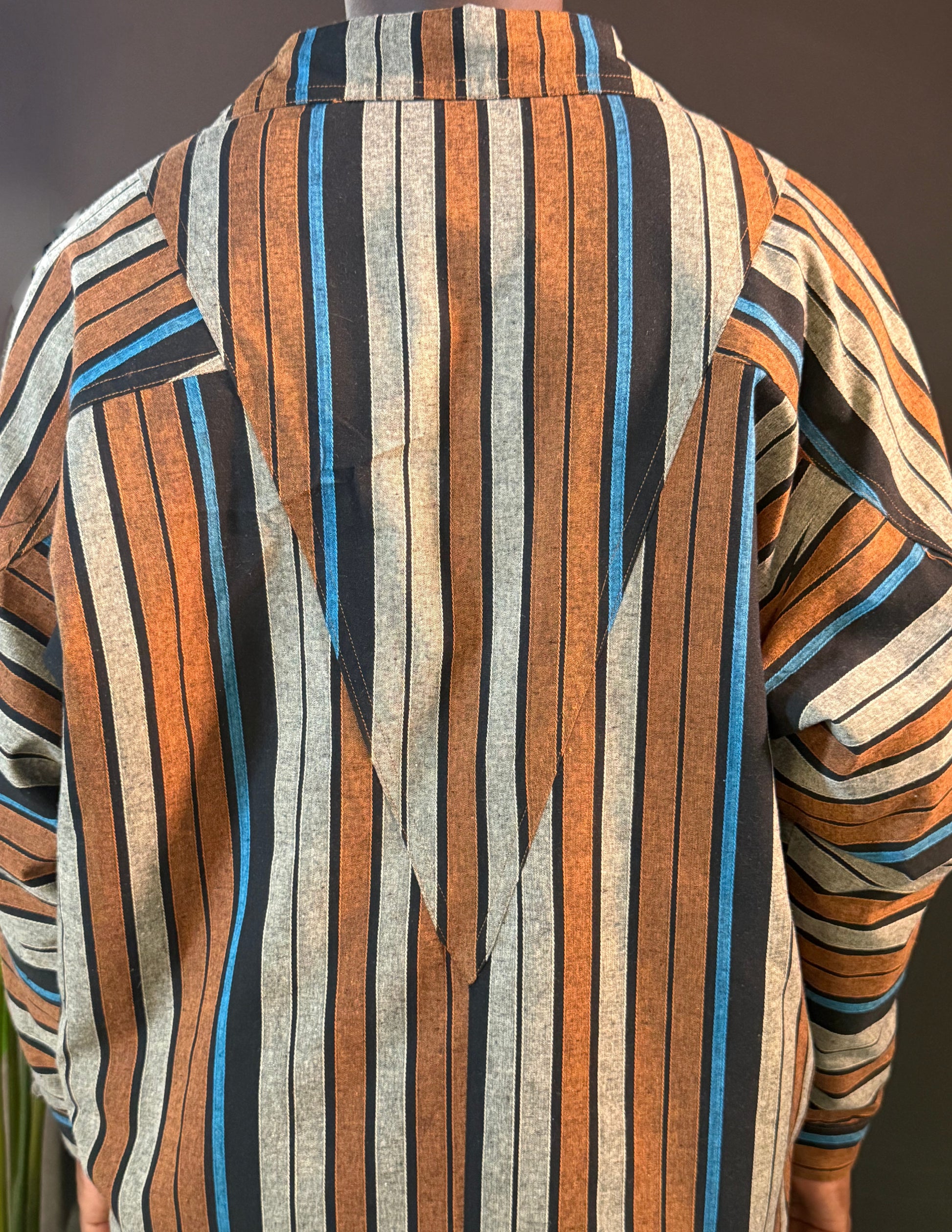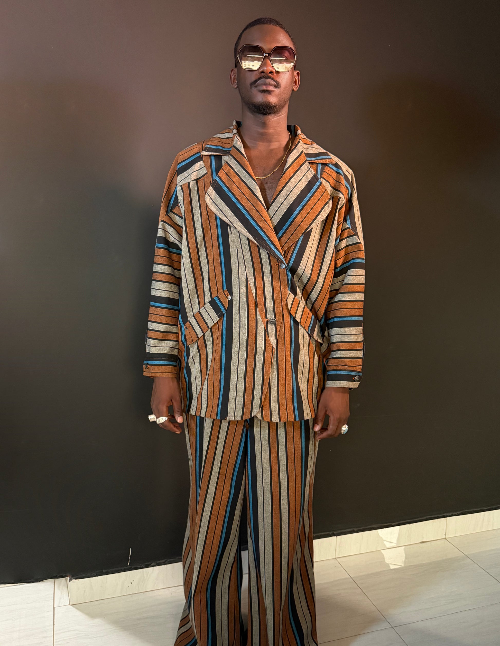 Masterfully crafted in Senegal from multi striped cotton blend. Our lined Zee Zee Striped Geo Blazer is ready for cooler light jacket days It boasts a linear patten arranged in a geometric design style. It has a double-breasted silhouette with our signature Marché logo stamped across the buttons. Style with our matching Zee Zee Striped Pant for sleek coordination.